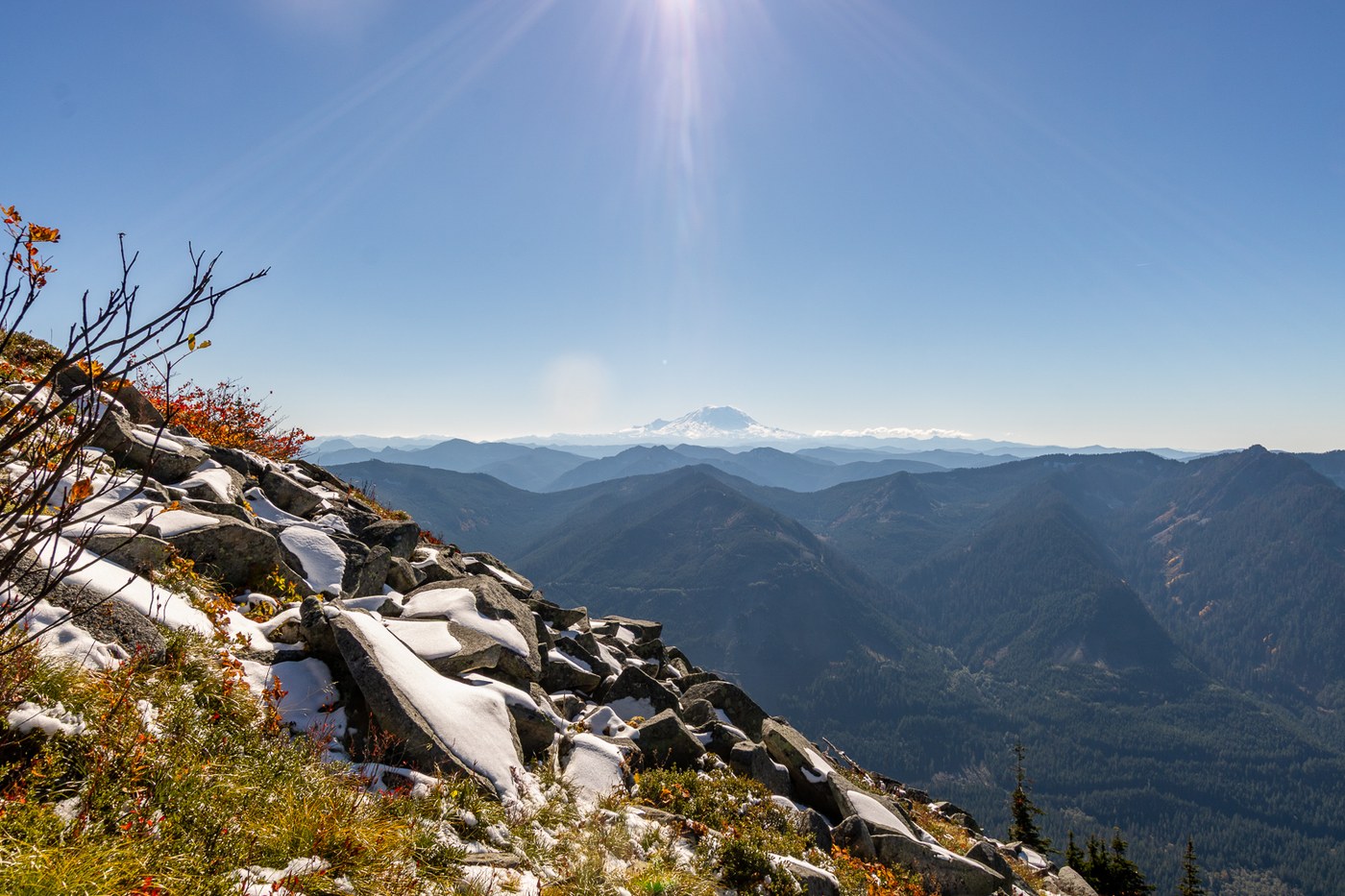 Beautiful day be on the trail. Rainier was out providing a spectacular snow-covered backdrop to the South. The trail is in great condition for most of the way up. A little bit of snow showed up on the side around mile 3. The final climb to the false summit has snow and ice in the shadows which made it a bit more interesting both up and down. The trail became harder to find near the top with no clear path to the true summit.