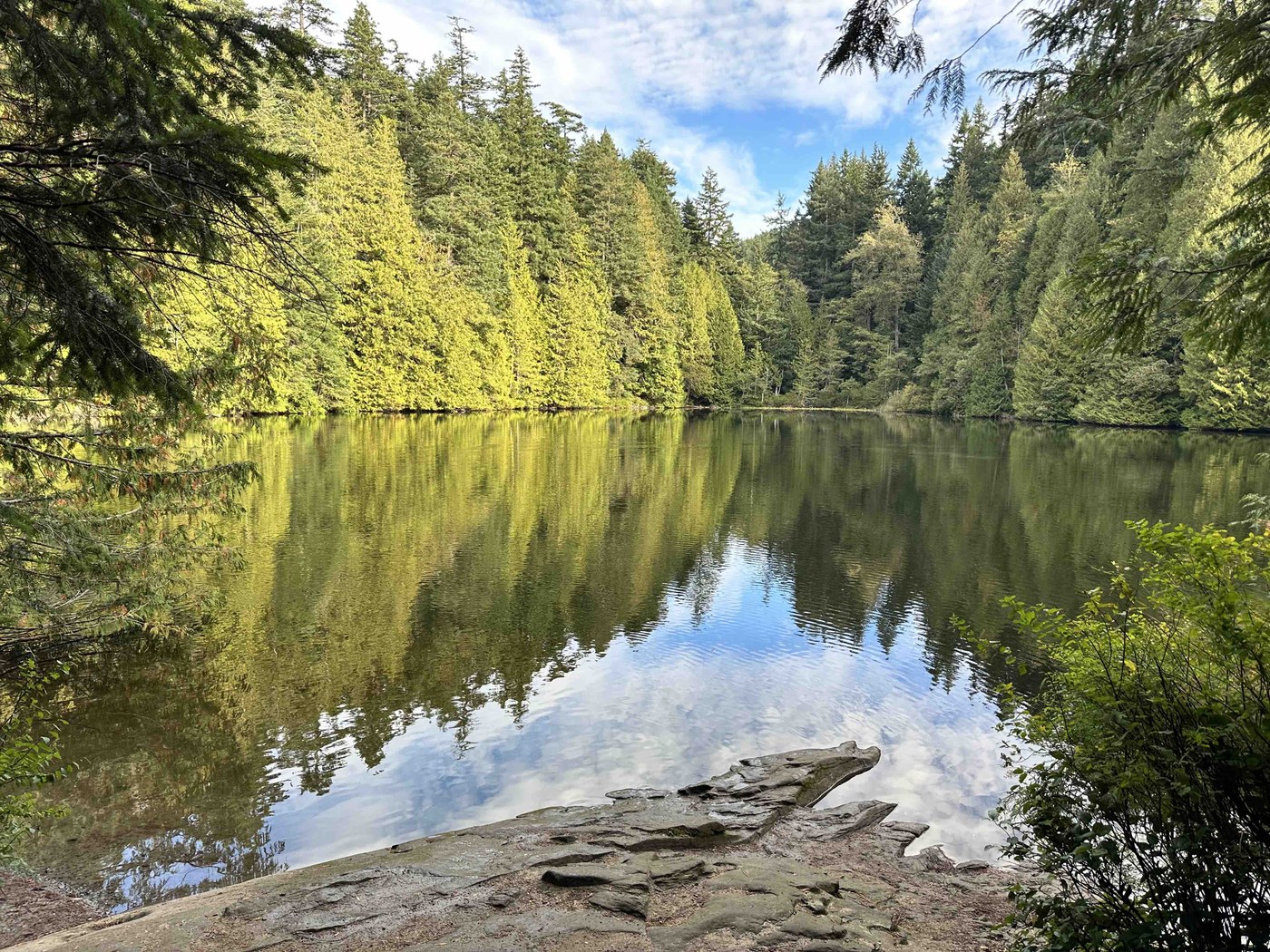 I was the second car at the trailhead just after 9am on this crisp autumn Wednesday. No facilities at the trailhead, but the toilets at the Lost Lake parking lot a few minutes away were clean and stocked, and other facilities are available in the park. Trail is in great condition, only one downed tree on the lake loop that needed a step over (picture below). The viewpoint allows for a wonderful view over the Salish Sea, and the lake was lovely and quiet this morning. Only met about 10 people on my forest trek today. Happy Hiking!