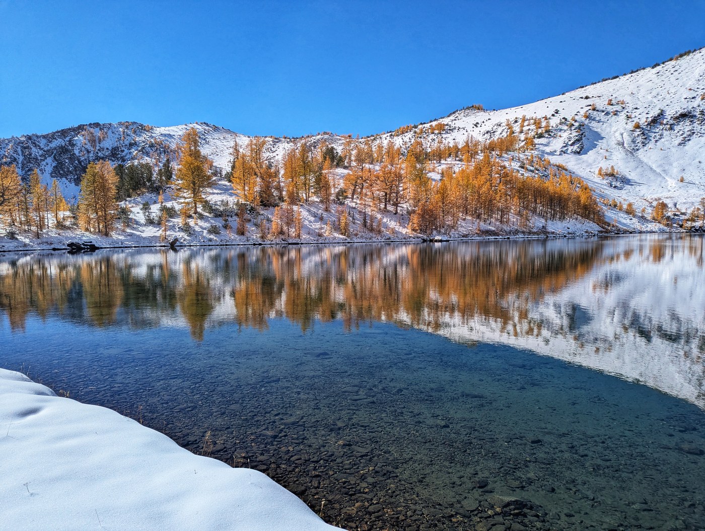 Anyway, this is a fantastic Fall / larch season scramble and we even had the luck of encountering the first layer of snow on the upper mountain turning everything into a Winter Wonderland.