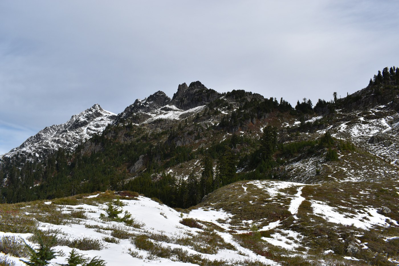 Trail: Snow started on the last 1/4 of trail along once you start going north on the ridge. For the most part the snow was very minimal and just piled up in snowdrifts around Sulphide Point and the NPS boundary. Views begin around that NPS boundary. Mt. Baker is right there! E