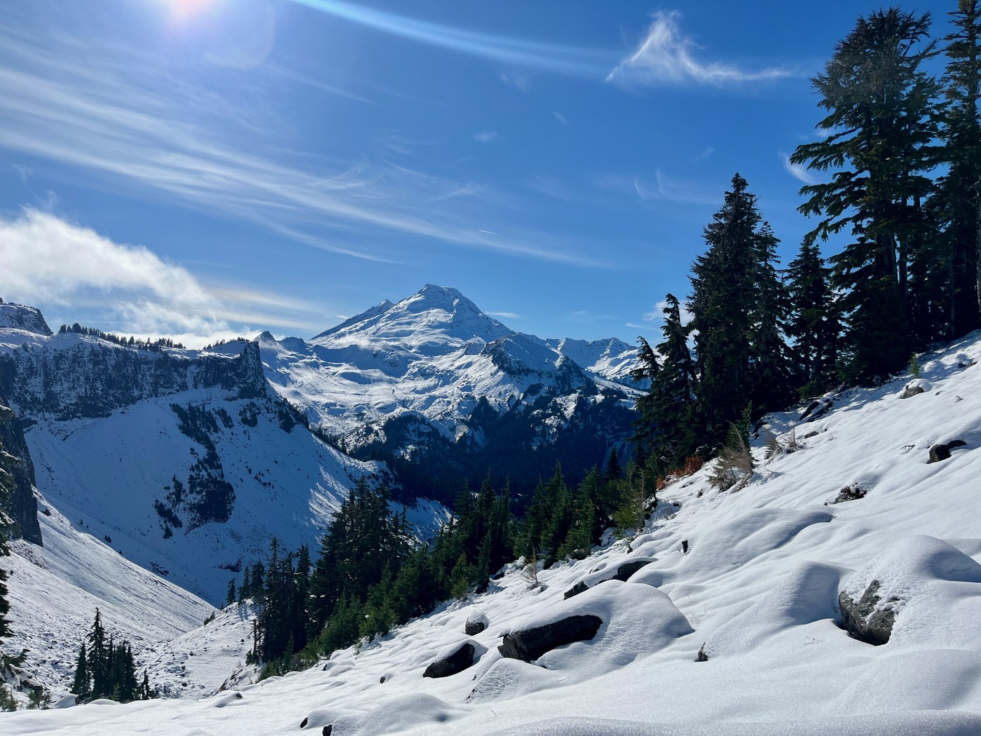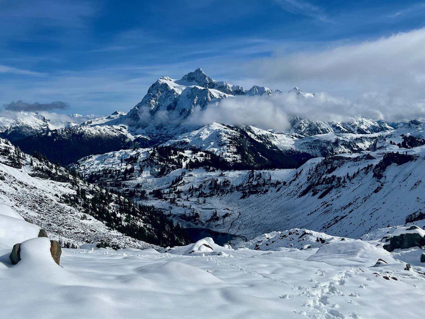 We stopped at the top of the saddle to take a long lunch break and enjoy the gorgeous views and Mounts Baker and Shuksan (photos). We met one hiker coming down who, like us, had gone only to the saddle. Tracks leading further along the Chain Lakes trail indicted that at least two hikers had continued for at least a short distance that way. However, the valley looked dark and uninviting and, given the trail conditions, we opted to go back the way we had come.