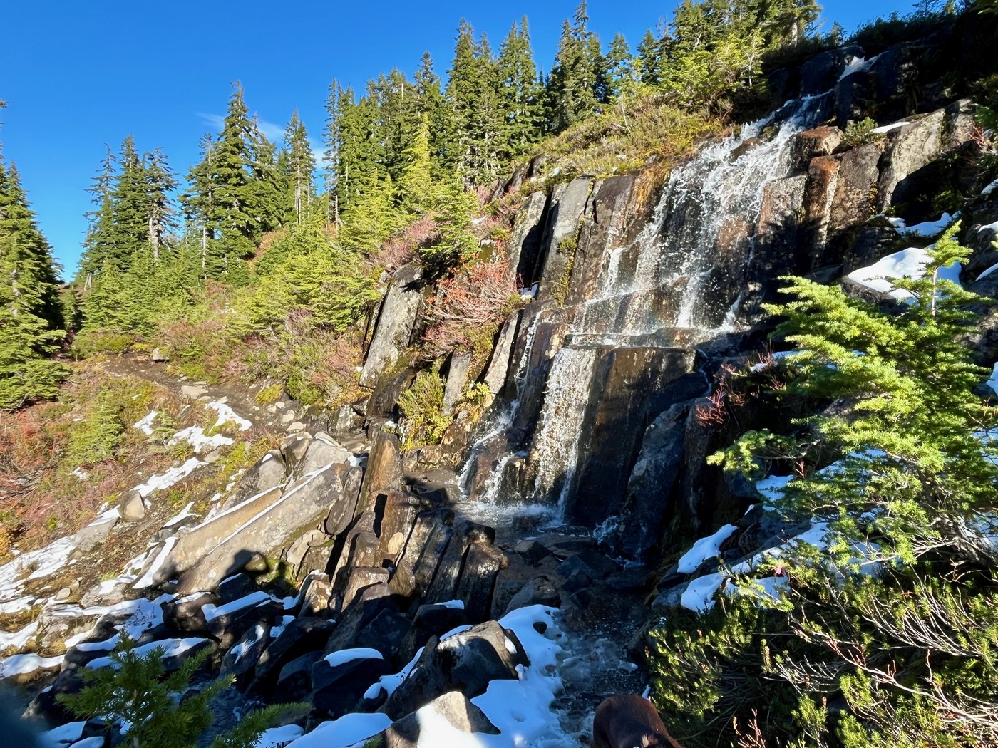 My overall assessment would be to avoid the hike up to Herman Saddle until the snow either melts or transitions into full winter conditions. The Bagley Lakes Loop is certainly doable but be prepared for wet and muddy conditions and the challenge of the waterfall. Skiers note: We did not find any snow deep enough for skiing anywhere along our route.