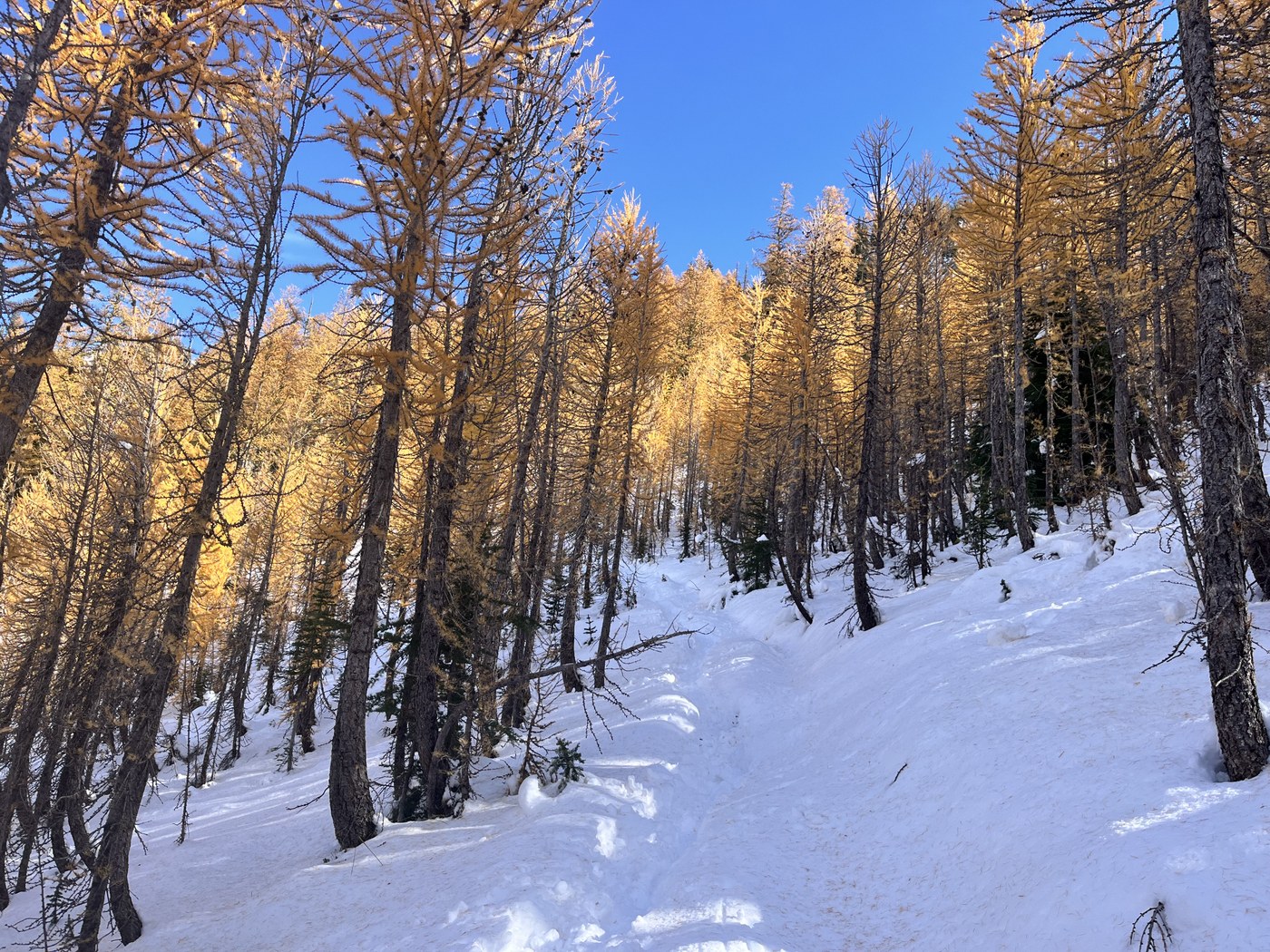 Beautiful morning to hike Carne mountain before the rain clouds rolled in. Freeze/thaw conditions on the trail and it was icy in the morning on the way up and muddy on the way down. Trail increasingly snow covered for the second half, with calf/knee deep snow between the basin and the summit. Trail was easy to follow until just past the basin then some route finding and trail breaking required through the snow. Hiked with microspikes and poles. Plenty of parking at the trailhead and it was a lovely quiet day on the trail- we only passed 6 other people. Larches past glacier basin a combination of prime and past prime, and they were stunning in the snow.
