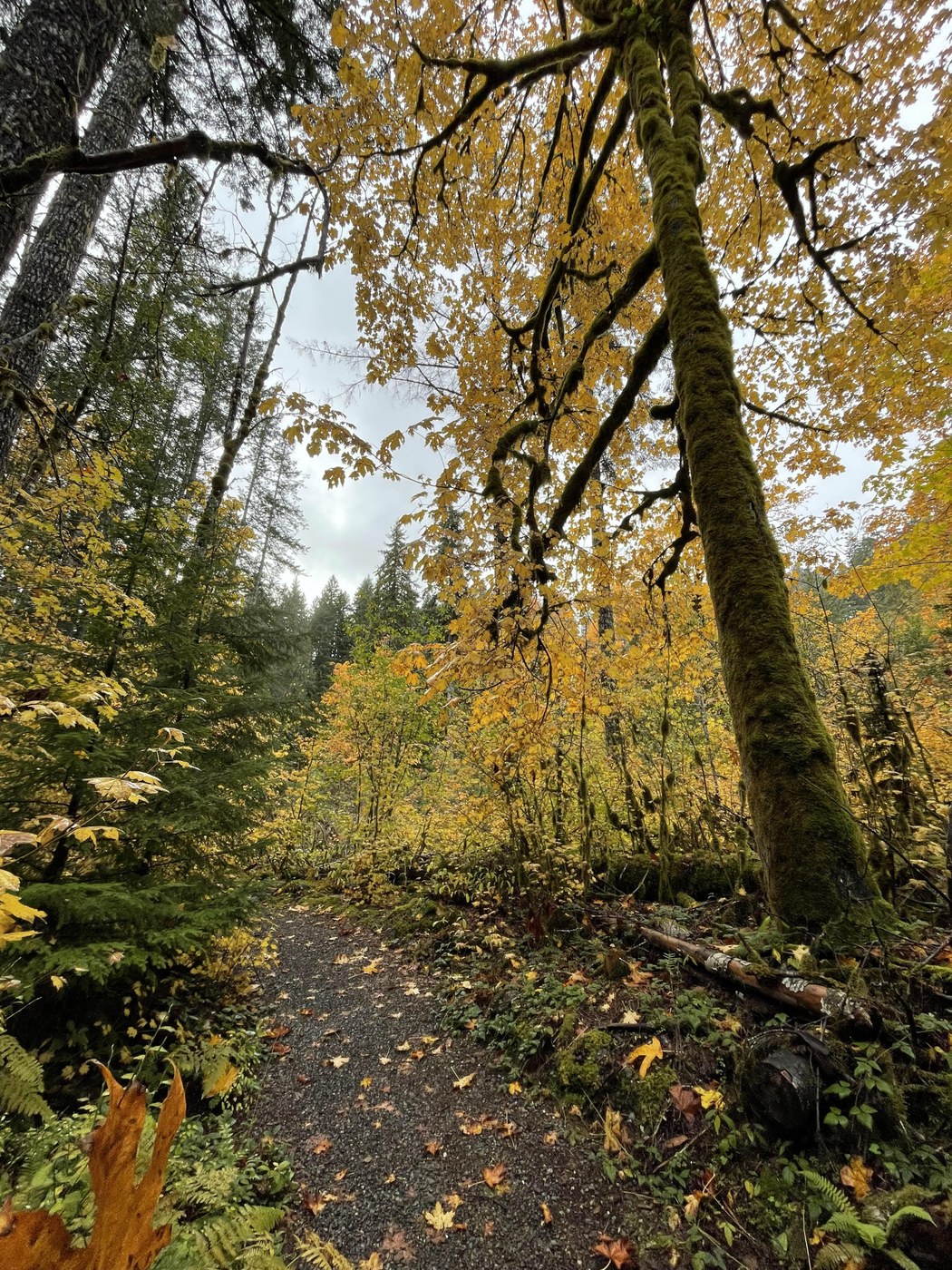 Upper Big Creek is in pre-winter mode with the gate to the campgrounds and the bathrooms locked. The trail is in excellent condition and one of the best to enjoy in rainy weather because water flows through the magic of brilliant trail engineering where it's meant to flow. There are a few downed trees, all easy to step over (one you can walk around and still stay on the trail). Two or three look fresh from this weekend's big wind (located on the water side half of the loop).