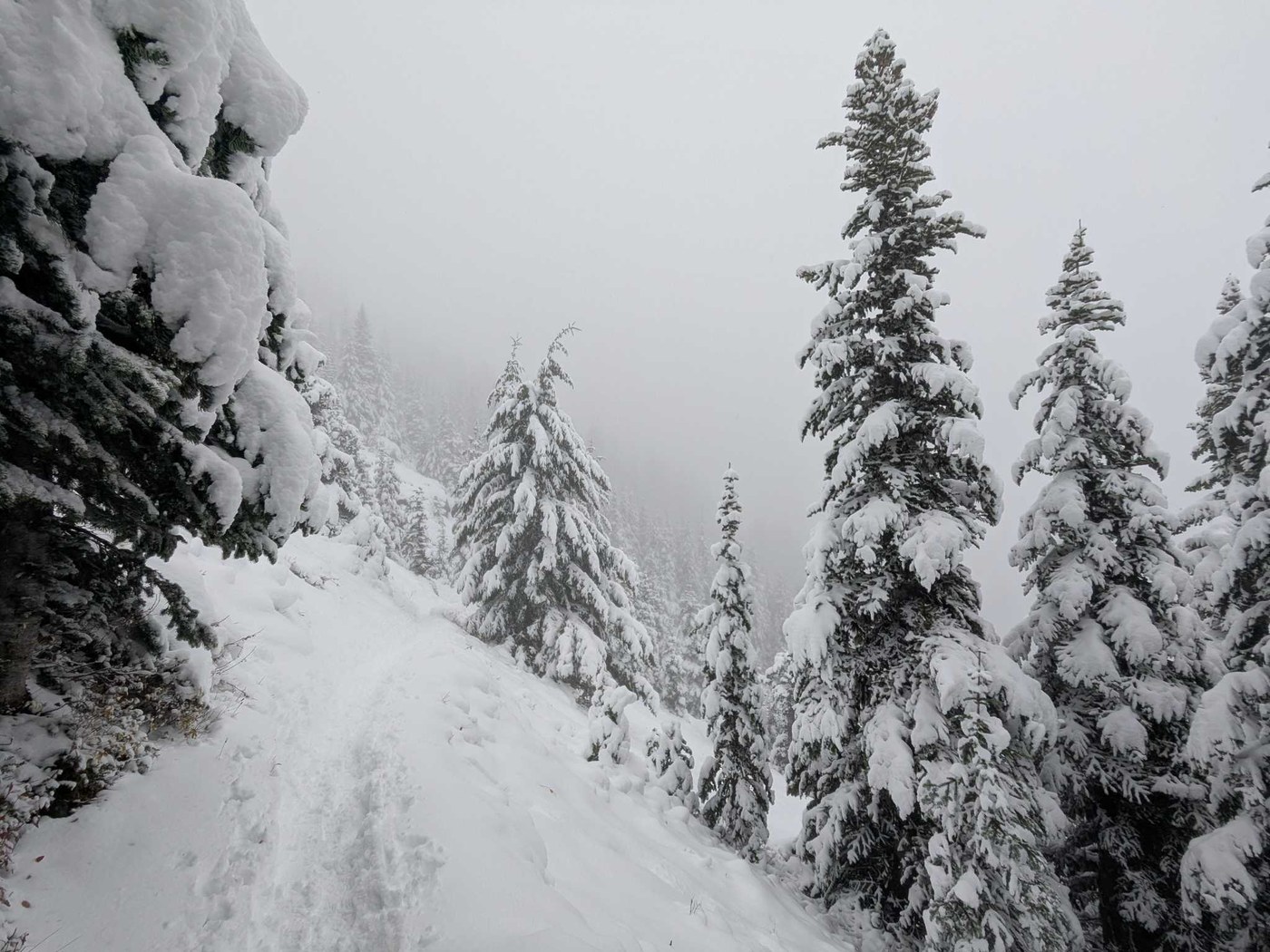 Snow has come to Mt Townsend. The trailhead was snow-free, but the trail soon turned white. By Camp Windy, we were in a winter wonderland. The trail is in great shape and is easy to follow, even in regular hiking boots. (The Silver Lakes Trail didn't yet have any footprints though.) Some post-holing was necessary to reach the summit, where the snow was about a foot deep.