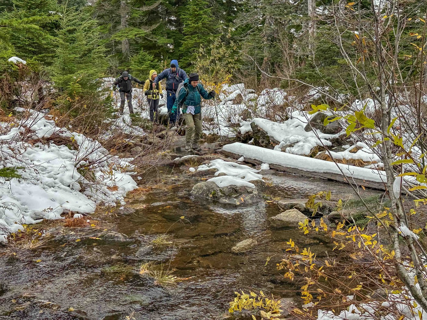 Our trip to Granite Lakes was windy with a little bit of everything; we encountered 3 inches of snow on the trail above the Thompson/Granite Lakes junction. One person used microspikes, several used trekking poles, but the snow was for the most part easily passable. There were just a few places where the slush was a little slick. I reminded everyone that shoulder season is unpredictable and plan to carry microspikes on my future Tuesday hikes, just in case.