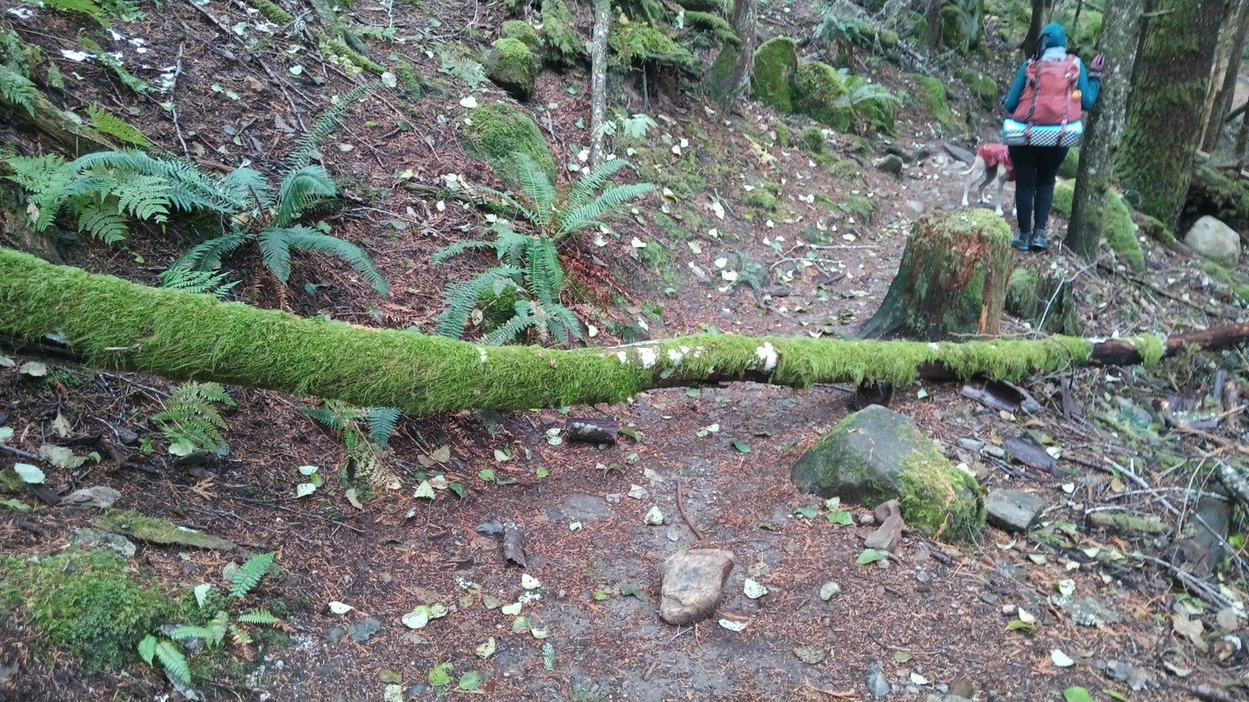 The first mile is pretty snow-free. Going up there was compact snow and ice on the bridges and boardwalks, but coming down there were mostly bare and wet. About 0.3 miles for the trailhead there is a fresh blow-down that is easy to step over. There were more sticks on the trail on the return, than out-bound, so windy weather can be a concern.