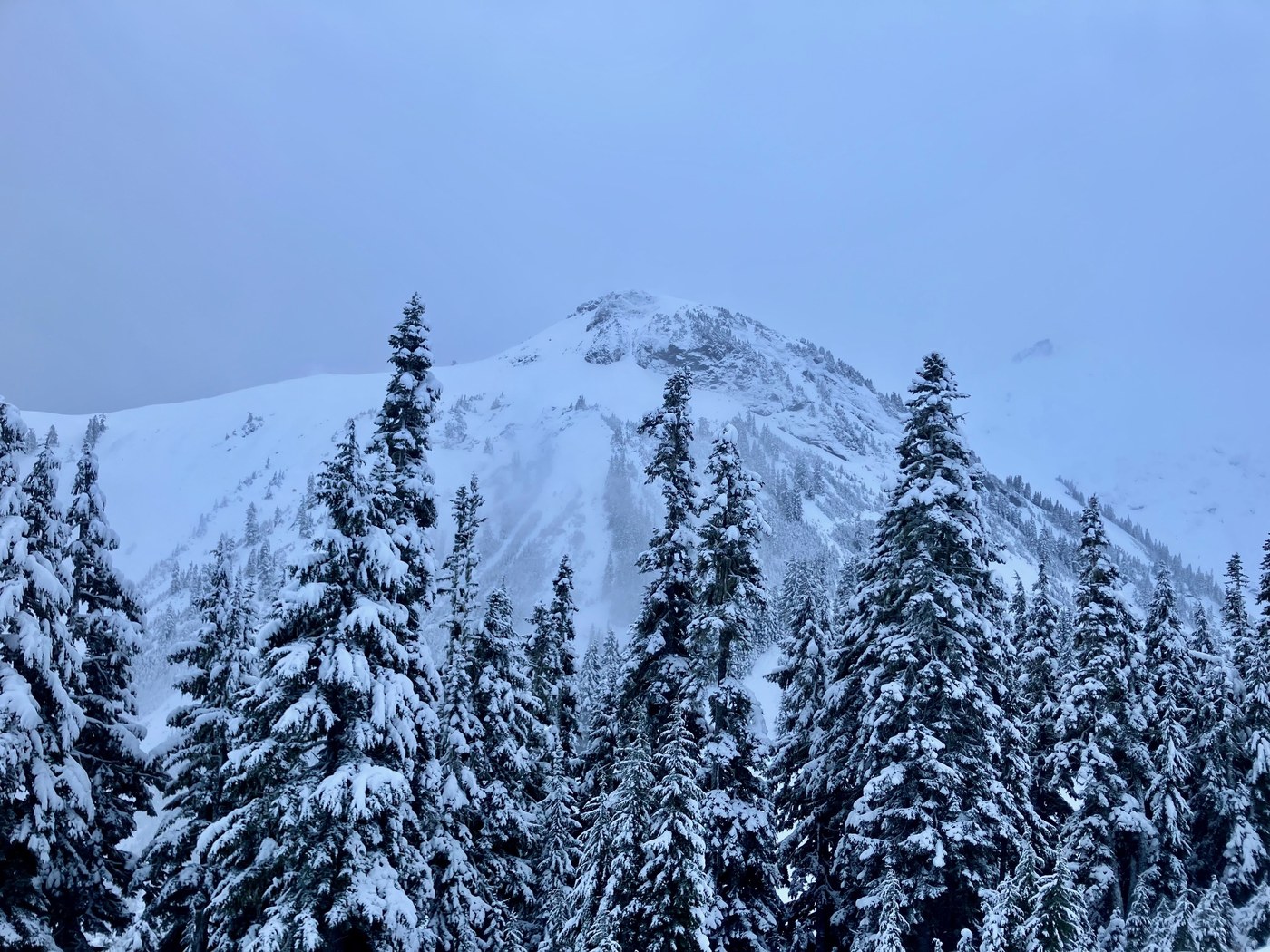 The first few miles of trail were covered in slushy snow but it became a couple feet deep close to the campground. Fall foliage was still visible in parts of the valley. The trail up to the peak was passable, but the dog and I turned around before the top because I was being blown over by intense wind gusts. It was snowing heavily and was very beautiful. I was glad to be dressed in snow pants and warm layers. I used spikes on the way down and a hiking pole. We passed a handful of people finishing the hike as we started and all appeared to be equipped with snow gear. We finished after dark and found one other vehicle who seemed to be camped at the trailhead.