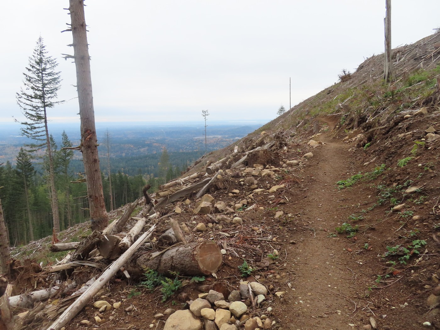I then got to the junction with the main TMT and started hiking up it. A ways up the trail while going through the conifer forest I came to an area of about 20 acres with lots of blown down trees from the Nov. 2024 windstorm. Some had come over the trail that you can walk under and while others had been cut out. Further on I crossed a DNR spur road that goes up to where the DNR logging operation on Middle Tiger Mtn. took place. I then got to the trail junction for the Middle Tiger Trail at Millan's Crossing. I hiked up the TMT a short distance to where it crosses over the new clearcut on the side of Middle Tiger Mtn. You now have a big viewing area to the southeast, south and southwest since the tall conifer trees are now gone.