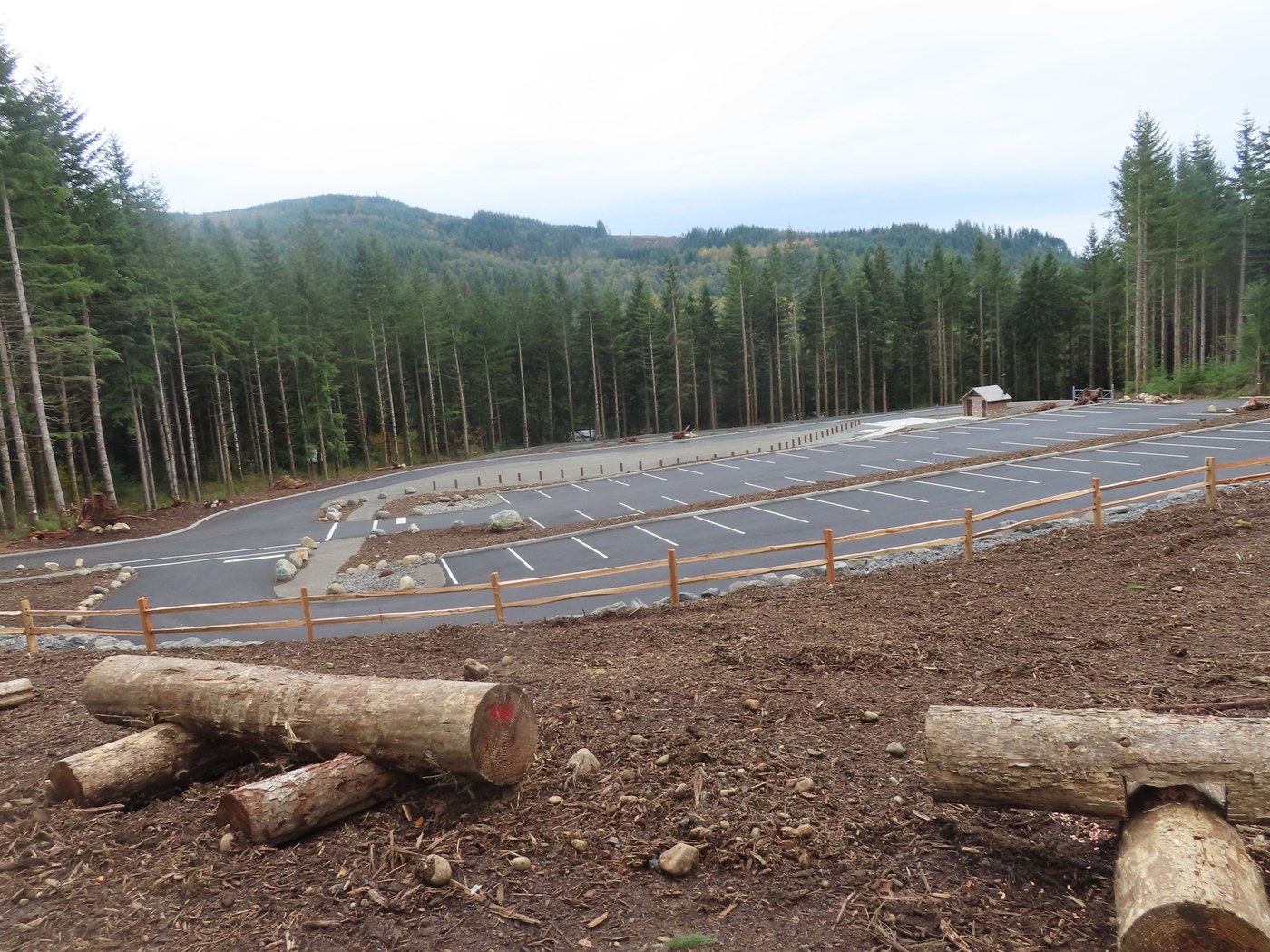 Since the DNR was finished with their logging operation on Middle Tiger Mtn., I wanted to hike up to the summit and check out the view. The last time I was up there was in 2018. I tuned off Highway 18 at Tiger Summit and had to park at the mud pond parking area just of the highway as the gate for the West Side Road was closed. I hiked up the road to the main DNR parking lot for the trailhead for the Iverson Railroad and Connector Trails. The old gravel parking lot with the wooden restroom is now gone. DNR has built a new larger paved parking lot to take its place with a brand new two door restroom. At the trailhead for the Iverson and the Connector Trails is a cement concrete patio area with bollards so you cannot park on it. Across the West Side Road from this parking lot the DNR built a second huge parking lot with another restroom. There are 170 parking stalls for the two parking lots. Both are paved and white paint stripes for the parking stalls.