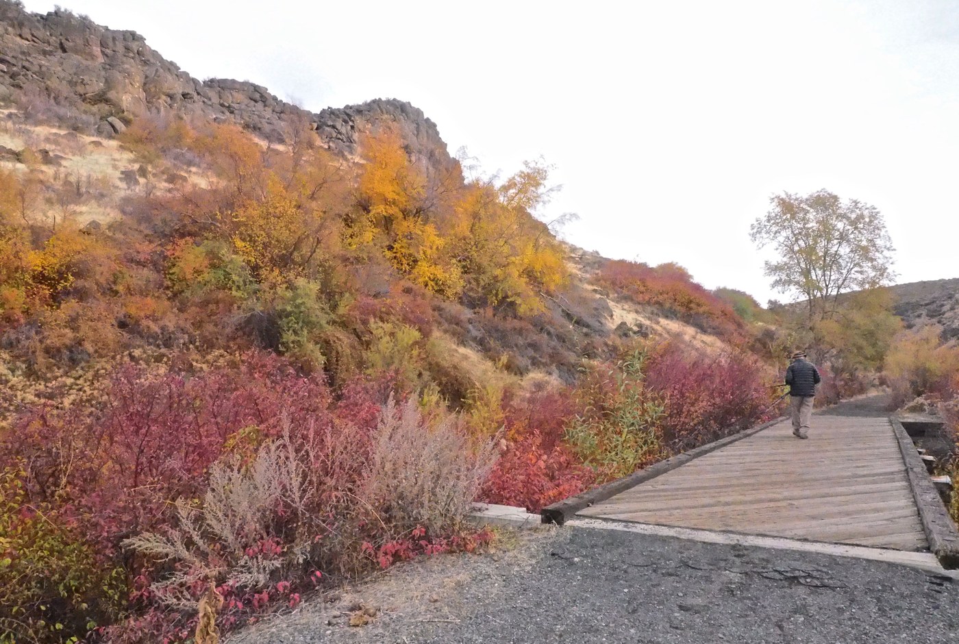 This afternoon we began our second hike in the canyon at the Weikel Road TH and walked to bridge 3 and beyond. There was less color here than at the East end of the trail. We knew that at at 88 and 86 we were not able to do the entire trail out and back as we have done in the past so after hiking from the East TH to the bridge washout bypass this AM, we returned after lunch to hike from the Weikel Road TH.