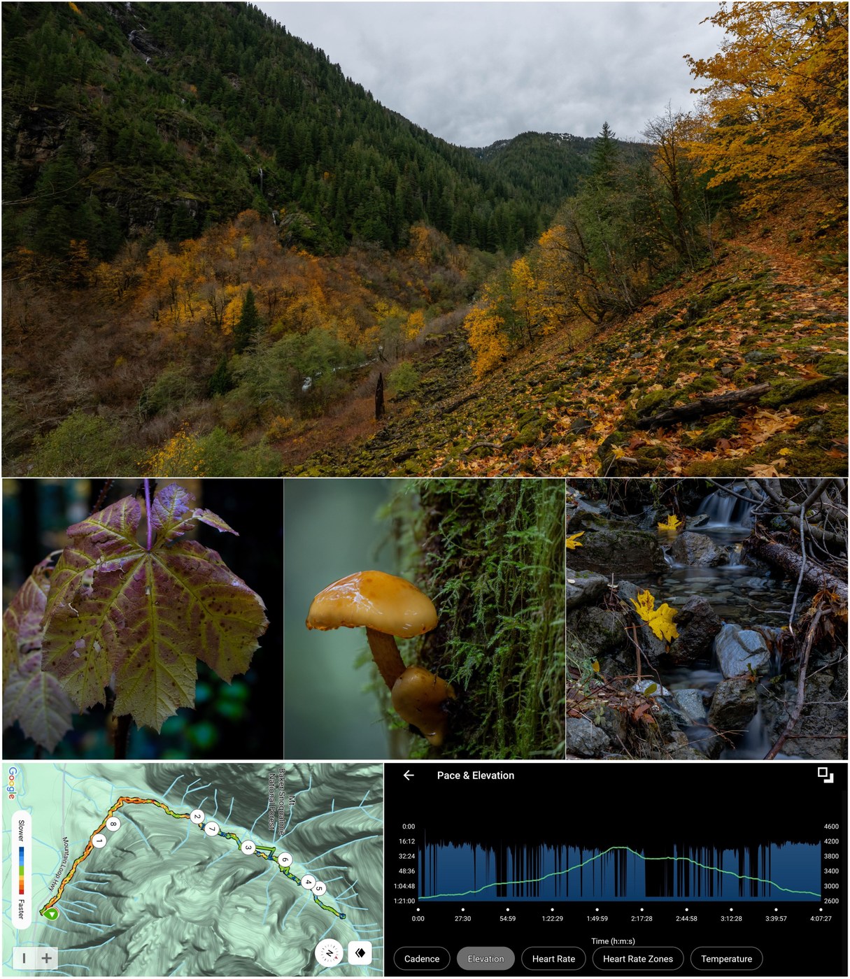 - Weather: Cloudy, 40Fs, no rain or wind; despite high freezing levels, there was still snow on the trees way up high, providing amazing contrast with the fall color in the valley.