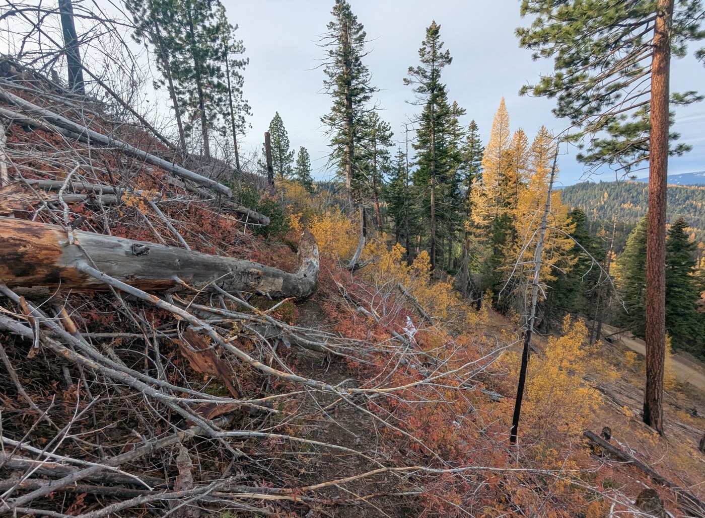 I got to the trailhead just before 9. There was one other car with a pair of women and their dog I would encounter again later. The vault toilet is open but not stocked. I chose to head east up to Swauk Meadow Peak. The view from the top (there's a bench!) was lovely, with the distant peaks dusted with snow, and larches dotting the forest. Wisps of smoke from a nearby fire, which I hear was prescribed, rose over a distant ridge.