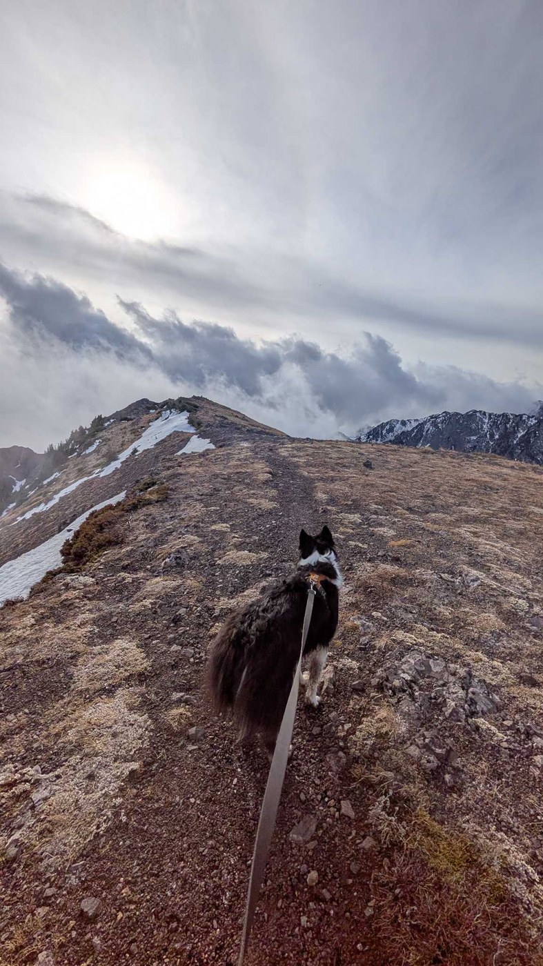 Arrived at the TH at around 8:30 and was the 2nd car in the lot. No issues with the roads and traffic was surprisingly light, even with the extra hour on the clock. We set off a few minutes later, just as other hikers started to arrive, and ran into the early bird hiker on their way down not long thereafter. We made it to the peak with plenty of time to quietly enjoy it by ourselves before other folks arrived from both directions. Fog obscured most of the views over The Sound while I was up there, but the Olympic interior was stunning (as always) and there was great visibility looking north over the Strait as well. Visited both peaks before doing a bit of a ridge traverse towards the Silver Lake trail but didn't go too far before doubling back and heading down the regular trail saddle; I'm sure it would've probably been fine considering the overall lack of snow, but I figured I should play it safe with the dog in tow, so I did. Saw a few more people who were on their way up while we headed down and the lot was full at the bottom.