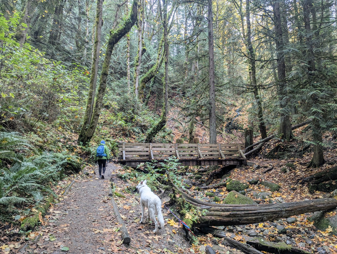 Time of year to start hiking the Issaquah Alps more...this is one the loops I enjoy from Sky Country trailhead. This time we did it counterclockwise, starting with the downhill along the Cave Hole trail, past Coal Creek Falls (almost dry), up to Quarry trail, down to Indian Trail, up Shy Bear with lunch on the bench at Far Country Lookout, and return via Fred's Railroad and By Pass. All trails in good condition with no blowdowns and no mud either. Rained almost the whole time but that sort of made the fall colors glow more. Except for a couple trail runners at the very start we saw only 2 other people the whole way.
