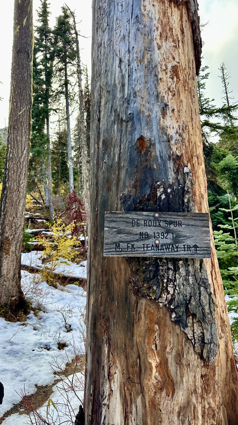 Started our hike at the De Roux trailhead heading along De Roux Creek. The parking lot was snow free. Once we got to the bridge there were visible patches of snow on the ground. Followed the trail up to the spur turnoff for Koppen Mountain and De Roux Peak.