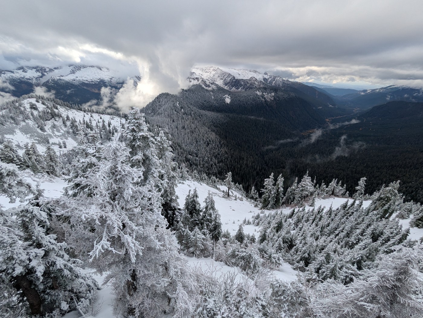 The trail became snowy as we ascended, and once we reached the park the snow was 6+ inches deep. The views were absolutely gorgeous, despite not being able to see the mountain through the clouds. Closer to the lookout the snow got much deeper, probably 18 inches in places. We were able to reach the lookout without snowshoes, but pretty soon they will be required. We saw about 8-10 other parties all day.