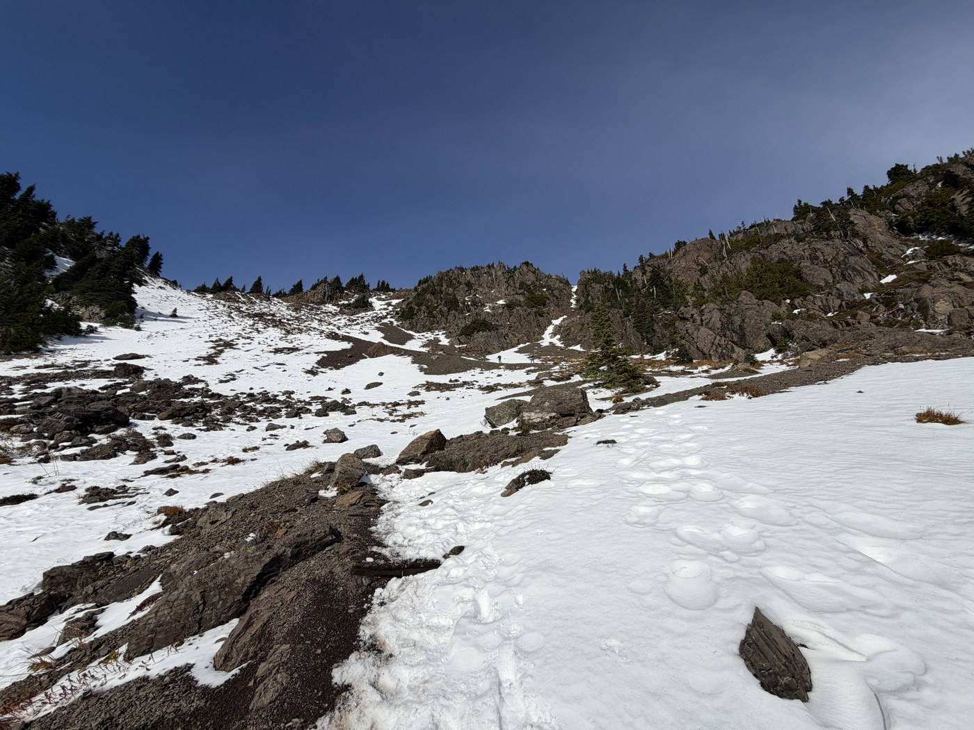 Patchy snow started for us around 4,400’ with continuous snow about 4,800’. We took the summer trail and on the ascent we never quite felt it was necessary to put spikes on, but it was a tough call on the final traverse around to the west side of the summit.