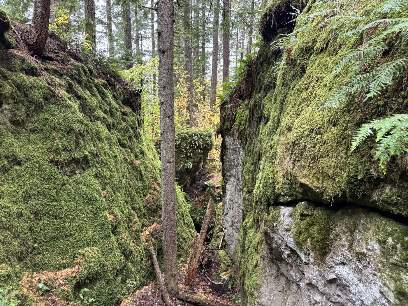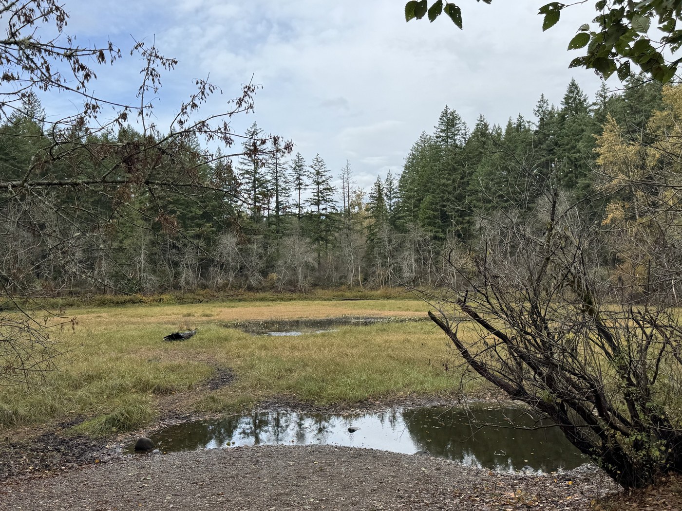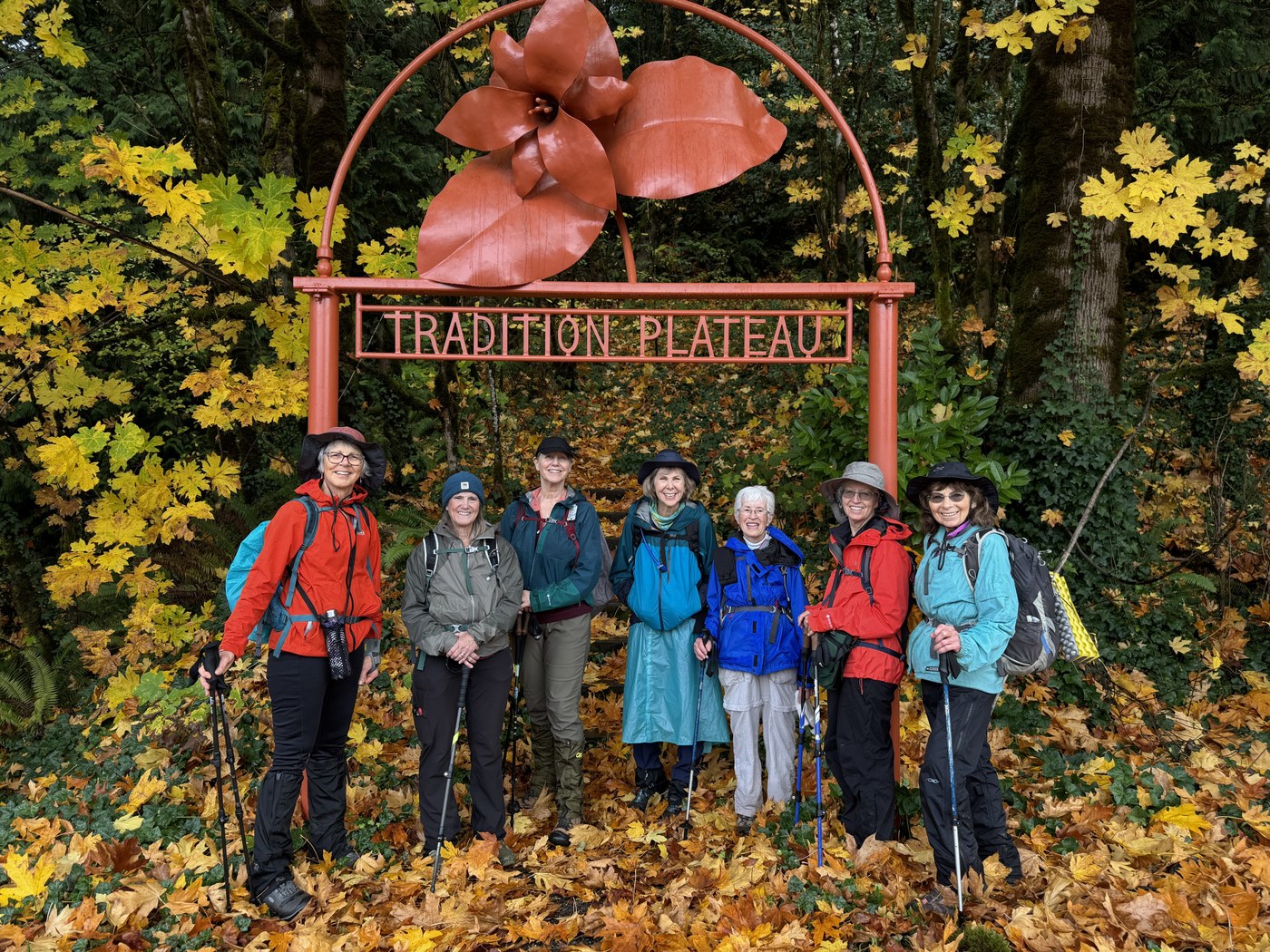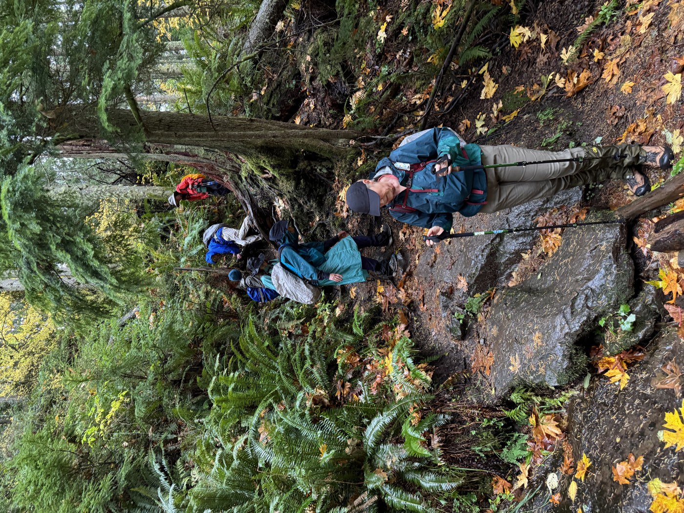 My hiking group started from the Senator Bill Ramos Memorial Th (East Sunset Way) at 9:15 today. Only 3 cars were in the lot when we drove up. There are no toilet facilities here so plan to green door. It was 53 degrees with light rain falling when we headed up the trail. Our route followed the Tradition Plateau, Wetlands, Adventure, High School, Section Line, Talus Rocks, West Tiger 3 and Bus trails back to the Wetlands for a 6.1 miles out and back lollipop loop hike. All the trails are saturated, well drained soil, some covered with big maple leaves. The only dicey spot was descending down to the creek after visiting the Talus Rocks on the Talus Rocks Trail. The roots and rocks were super slippery and we took our time facing the trail and navigating giant step downs. Several downed branches lay across the trail were the waterfall stream comes down. I choose to step on the rocks and gravel that were present. We had to step over 3 downed trees on our route the largest was just before Round Lake. Trail traffic was super light, most likely, due to the rainy weather forecast. We passed less than 10 trail users the entire time we were out. The hillside is still holding onto brilliant yellow color from the deciduous trees. We spotted a few mushrooms but not as many as I was expecting. The skies parted briefly when we walked up to Round Lake. This was the least amount of water I have seen here. It looked like a giant puddle with grass and cattails poking out. We stopped at the Tradition Plateau gate way Trillium arch on our way back to the trailhead. Rain started falling in earnest when we drove out at 1:30. Another fantastic day out in nature with friends.
