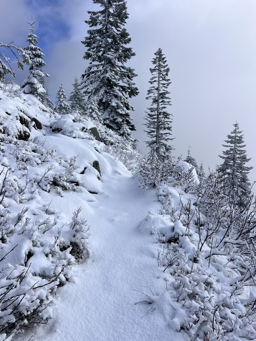 There was a dusting of snow starting around 4300 feet and an inch or two along the Traverse around 5000 feet. The trail was usually easy to follow, even on unbroken snow, but became more challenging at the junction between the winter route and the summer one.