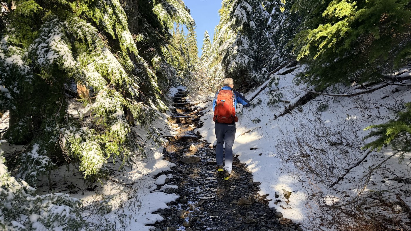 Gear: Waterproof boots, poles, microspikes. Gaiters would be useful but we didn't use them.
