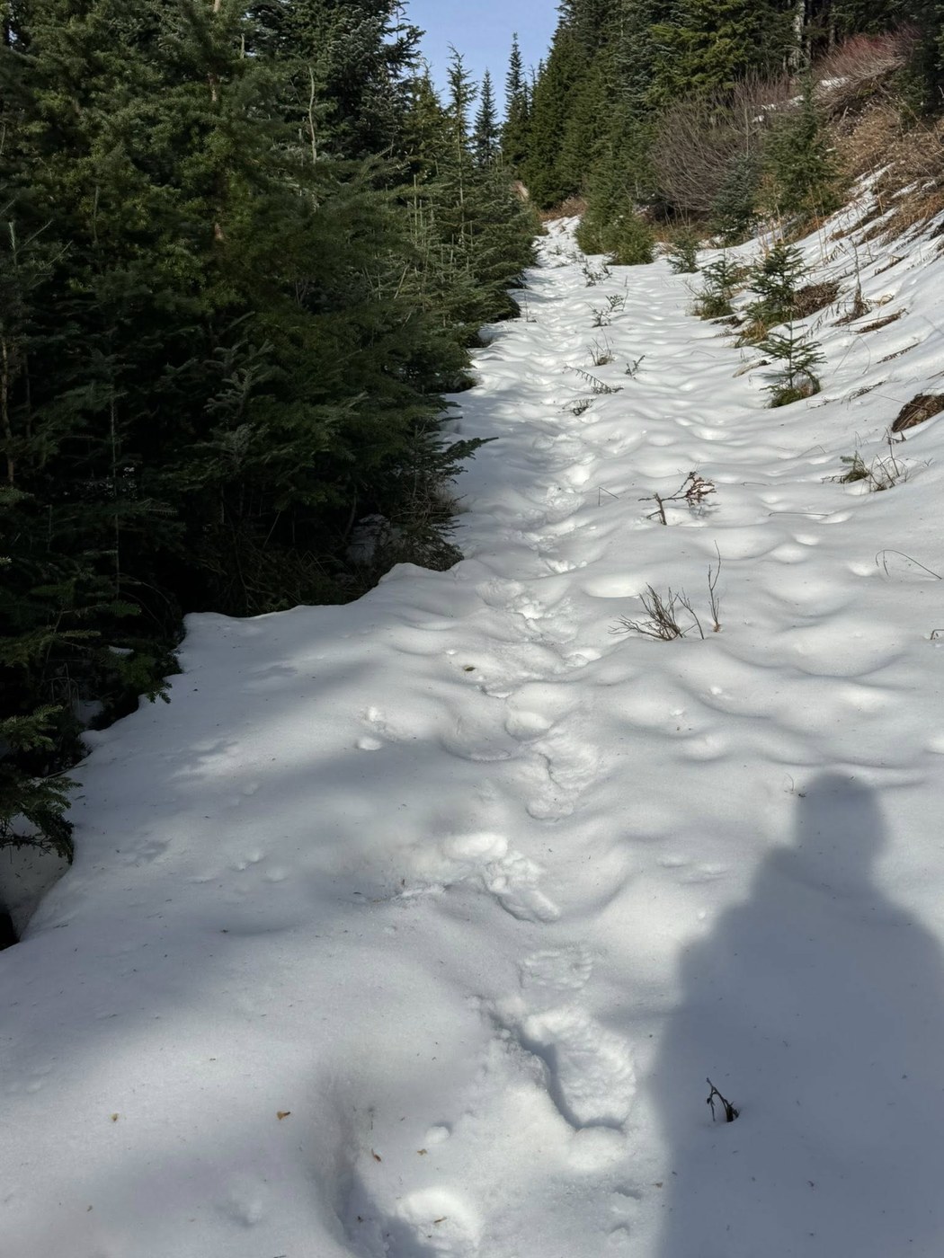 I arrived to one other car at 6:45 am this morning. There are a couple trees down along the way, but overall, everything is in fine shape. Creek crossings doable with ease. I was pleasantly surprised that for the most part, I was shielded from the vicious wind that I could hear. This made the climb actually very hot! I was down to a t-shirt and wished I had shorts instead of pants. Trail is snow free until you hit about the last 1/2 mile. However, it's patchy and rarely more than a couple inches. I did not need traction or gaiters. Of course, this will probably change in the next few days...