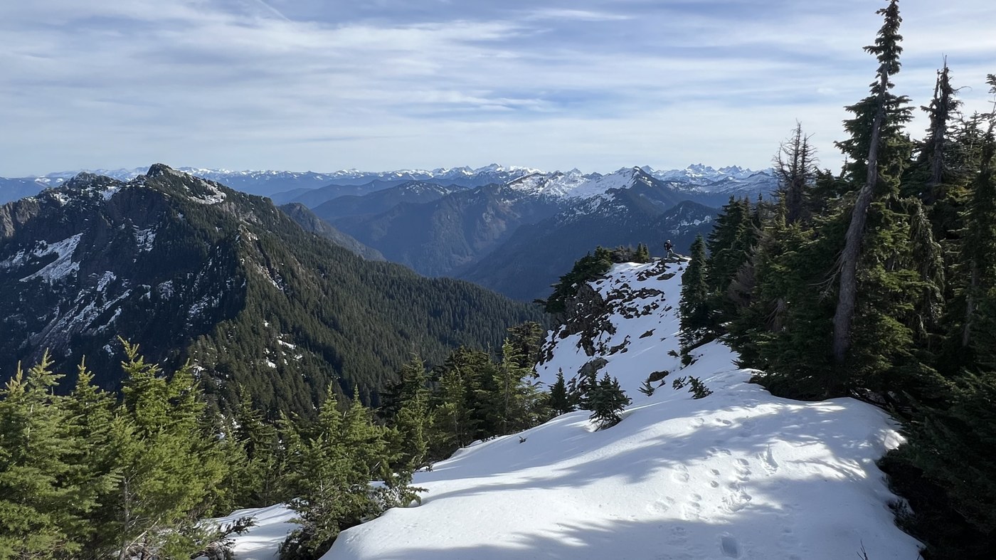 Tough Peak to get too, but it had some great views!! After about 30 minutes on the summit, we headed down. We followed our prints down in the snow to where we first saw their prints from the previous day, and then followed their prints straight down which led us to some nice open forest. Terrain was steep, but with no brush we made great time down to the lake. There was a couple sections of brush, and we had to cross a ravine, but we made excellent time down to the lake. Once at the lake, we had one 100ft brush bash through some alder to get to the west side of the lake, and some nice flat open forest. We then found a trail that took us to a very nice camp next to the western shore of Crater Lake. Here we followed the lakeshore to the outlet stream. There was some minor rock hopping, and minimal brush, but so much easier than the eastside of the lake. At the outlet stream we were able to rock hop across, and get on back on the trail. We then hiked back to the car. We missed one turn coming down and had to backtrack a short bit, so beware of that.