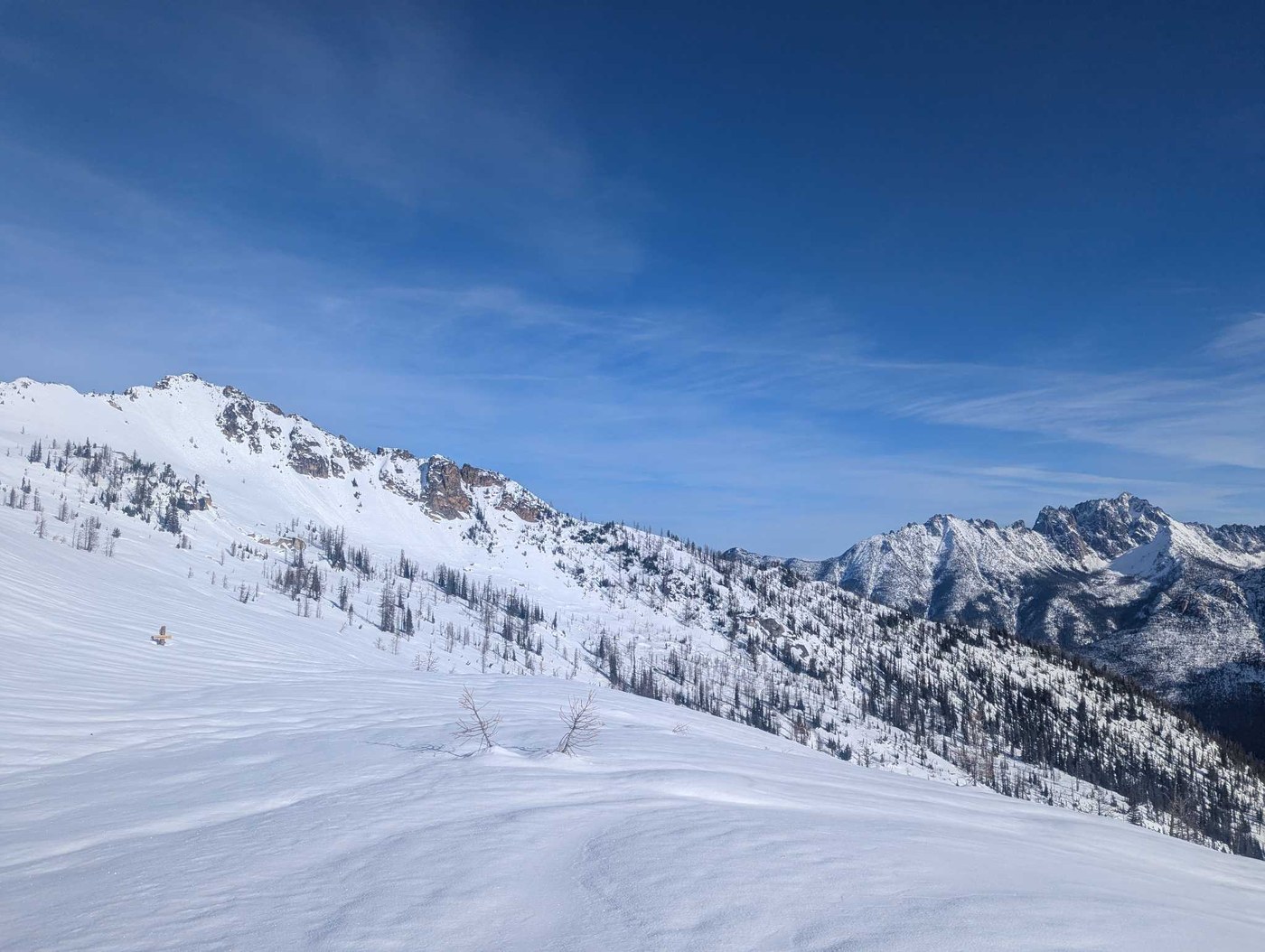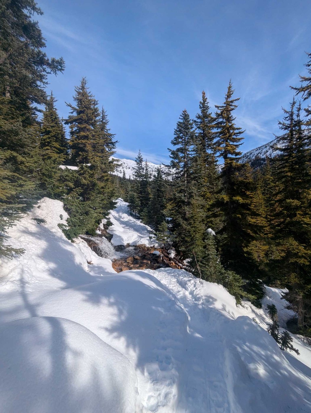 This beautiful snowshoe felt like a special opportunity with the road still open. I got to the trailhead at 9:30 and parked on the highway, as the road up to the trailhead from the highway was snow covered. There were a few other cars, but their drivers must have been heading to different destinations, as I saw no one on the trail all day. Folks had clearly previously broken trail, presumably over the weekend, so that made for easy snowshoeing as I started off at 9:45. I wore snowshoes the whole time, which was entertaining in early season conditions- there were plenty of areas lower down where the trail was bare and I walked on snow alongside it or sometimes on the wet trail, and I crossed quite a few streams via rocks while wearing my snowshoes. The snow started off hard and got softer as I reached sunny slopes, so I was happy to have snowshoes with fairly solid traction on them for the day. At 6150' the broken trail left the actual trail and started straight up without switchbacks. Enjoying not breaking trail, I followed the steeper route straight up to the top. The larches are all past prime, but it was beautiful to see snowy peaks all around on a clear day. After enjoying some food and the views, I headed back down, reaching the car at 3:45. I'd recommend doing an avy risk assessment and being prepared before heading out given the slopes above the trail.