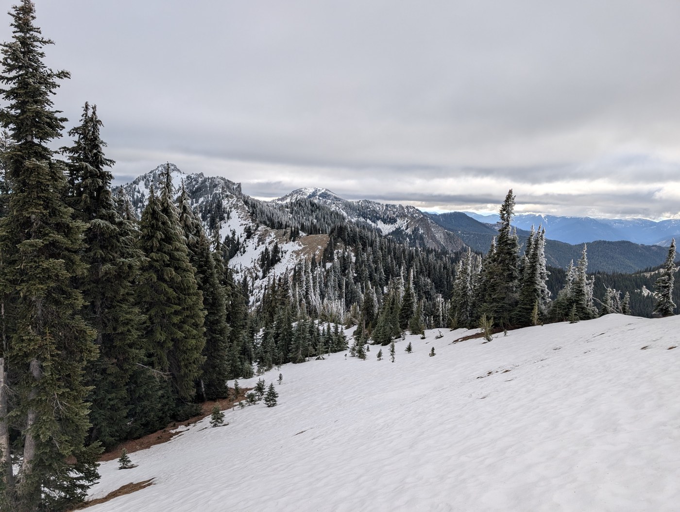 The summit itself is bare rock, with the aforementioned basin area having some nice tree and terrain protection from the weather. The wind was howling at the top, and with the temperature being about 30 degrees, we did not stay up there for long! Views were great over to Hawkins Mountain, Esmeralda, and Davis. We could really see Stuart or anything else distant due to cloud cover. The basin was a great spot for lunch among some cool snow-flocked trees.