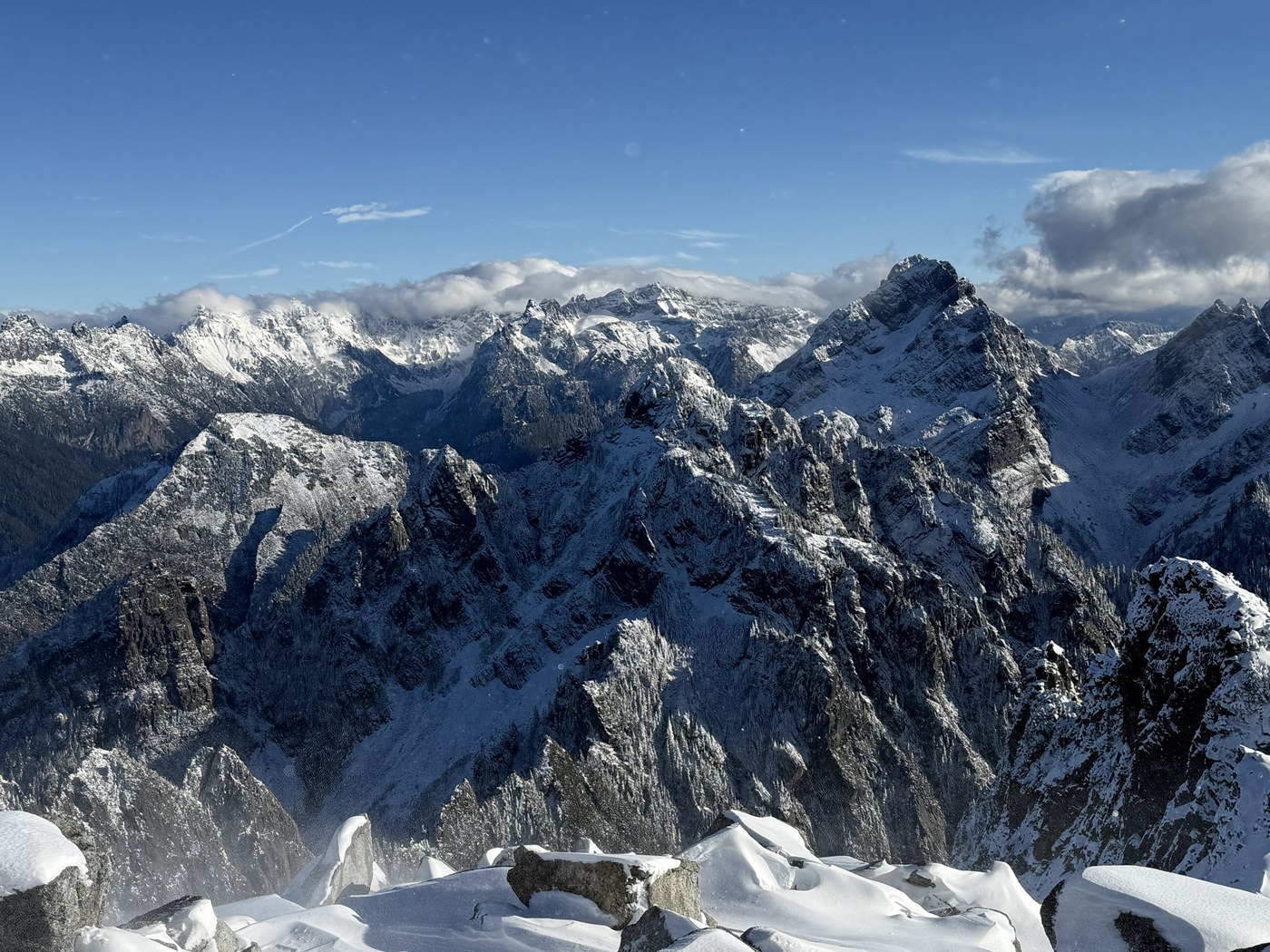 Gusts picked up fairly heavily at the summit, but fortunately the clear skies remained as did the brilliant views. Downclimb and return trip was uneventful.