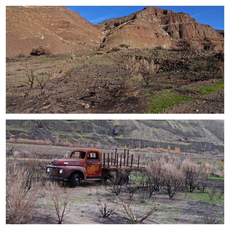 We have been camped at Maryhill SP since Thursday and today we drove to this park which is only about 30 minutes from Maryhill . On June 11th the Ferry Fire which was about 1.5 miles south of the park ignited and burned throughout the park causing evacuations from the CG which was full. The host told us today no structures were lost except for tables in the Hiker-Bikers CG area. The CG reopened on 6-20. We walked the Palisade Trail and evidence of the fire was evident for about 1/4 mile. The fairly wide and flat trail follows the John Day River beside the beautiful Basalt Columns on the non-river side of the trail. It was 55 and sunny when we began our meander. We walked from the parking lot to the walnut tree where we had lunch on a bench before returning to TH parking lot. We did see six sheep on a hillside on our return. I will add a link below about the fire.