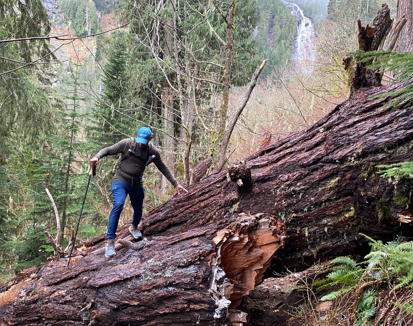 The big tree across the trail indeed has some footholds cut into it, but they are not too large so take care. Especially in the rain. What I think is interesting about this tree is that you can see how it snapped off well upslope of the trail and then tobogganed downward for maybe a hundred feet, branches getting stripped on the way down. Just bad luck that it finally lodged itself right across the trail.