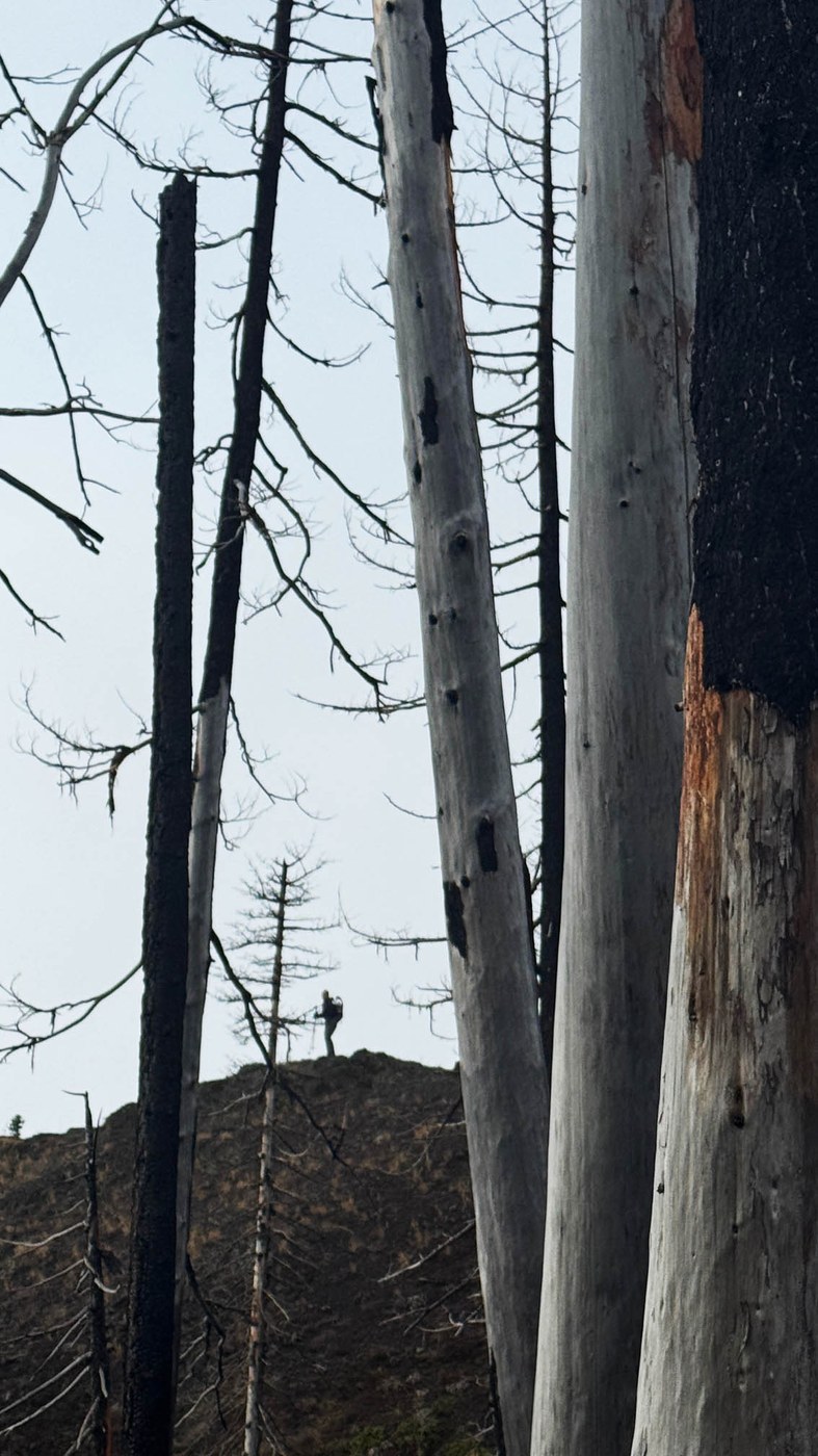 We had hoped that the forest floor would be better this way, but while it had less spiky things and slippery talus, it was basically 3000' steady decent through blow/burn downs and grabby things. Still not sure how managed without a major face first stumble.