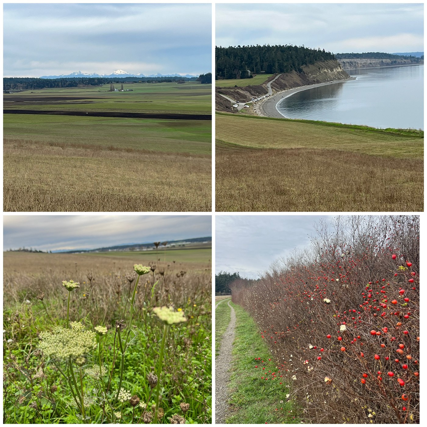 Ebey’s Landing is always a good choice. We started at the upper lot and looped the prairie before hiking the bluff and returning along the beach. The trail is in great shape. Lots of mushrooms in the woods and no mud to worry about. Vault toilets at the top and at the beach clean and stocked.