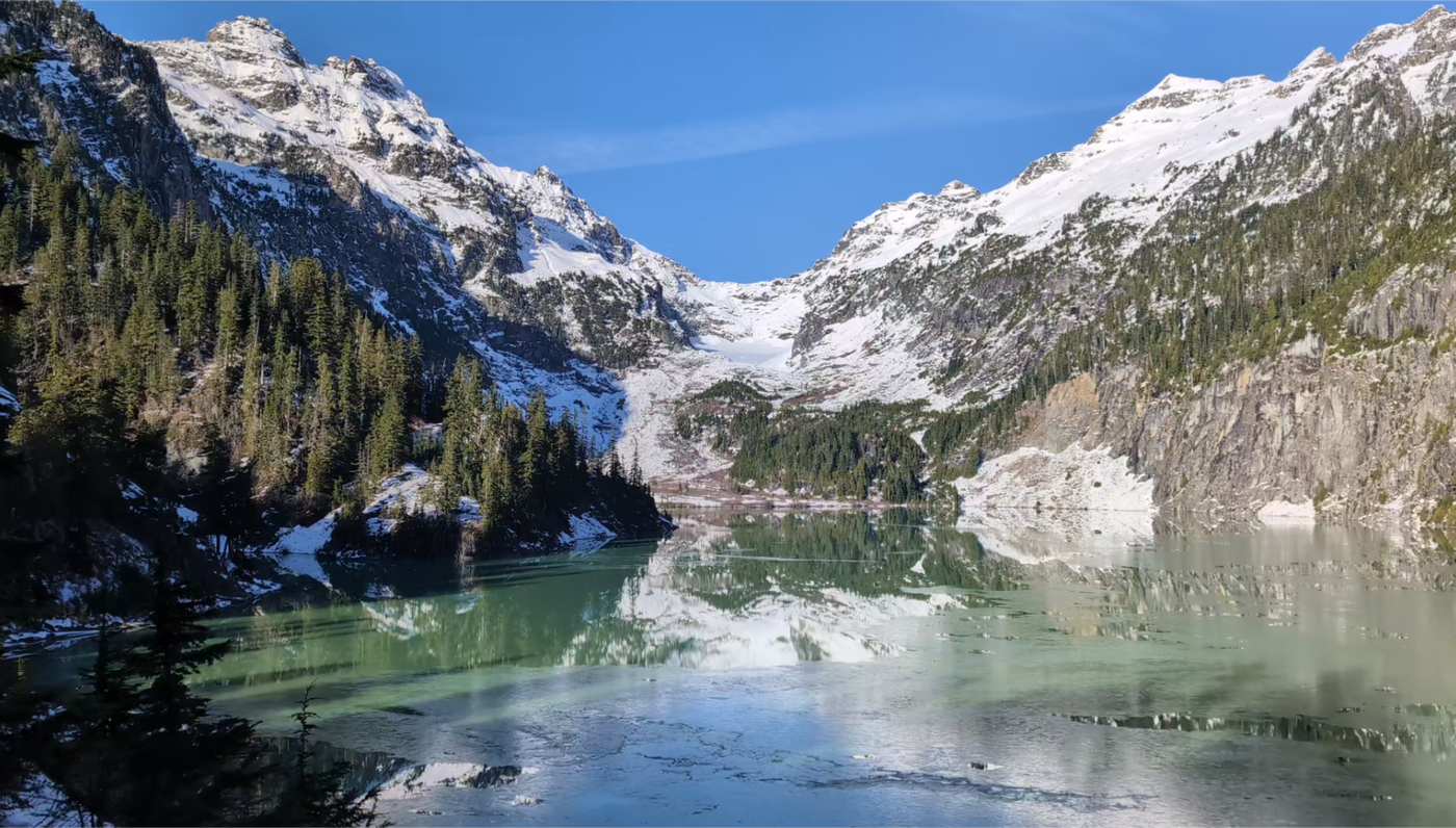 Perfect! Snow started about 1.25 miles from start (road closure, not th) and got consistent around 1.75. Trail was almost completely dry because just about everything was frozen. Spikes and poles recommended. Blanca Lake was starting to frost over but still had a enough free water for a bit of a reflection.