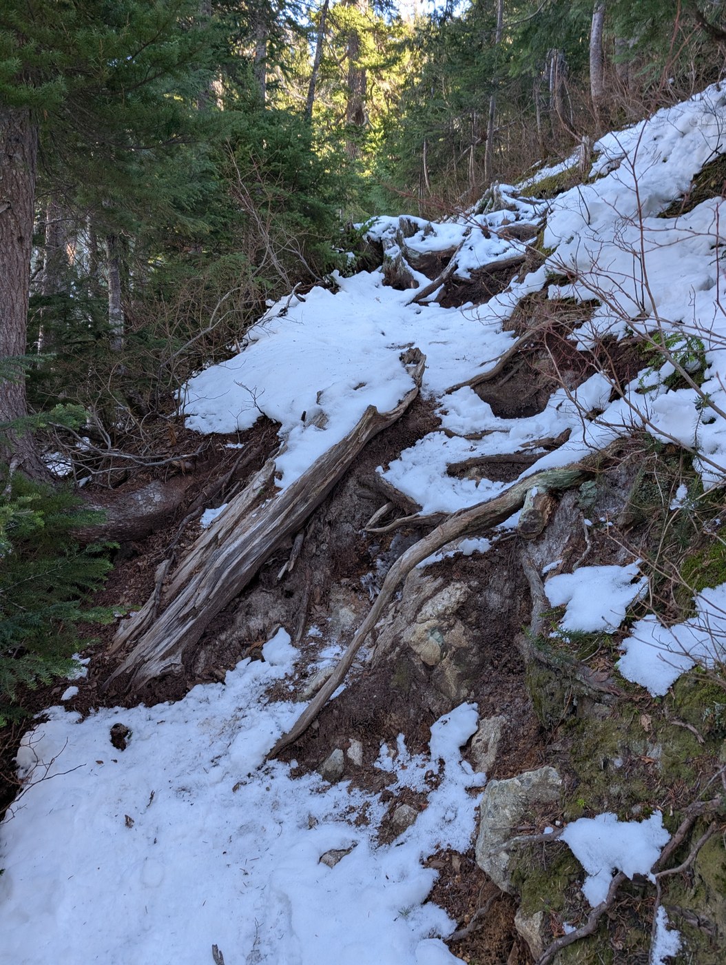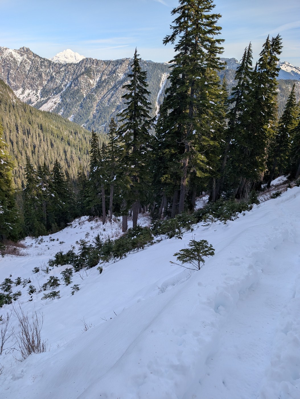 Trail: There is an extra ~.5 miles road walk with about 100 ft elevation gain. Keep left at the intersection to go up the hill to the TH. The trail has a pretty steady incline with decent terrain up to just before Virgin Lake. There was only one duck under, one swing legs over, and a couple step over tree falls. Around the Glacier Peak view area, just a bit before Virgin Lake, there is some snow travel with potentially hazardous terrain for avalanches (if there was more snow) and potential risk stepping off the edge due to snow. Not bad in my opinion, but worth a mention. In this area there are also a few peak-a-boo views of other peaks, like Lyman and Dip Top.