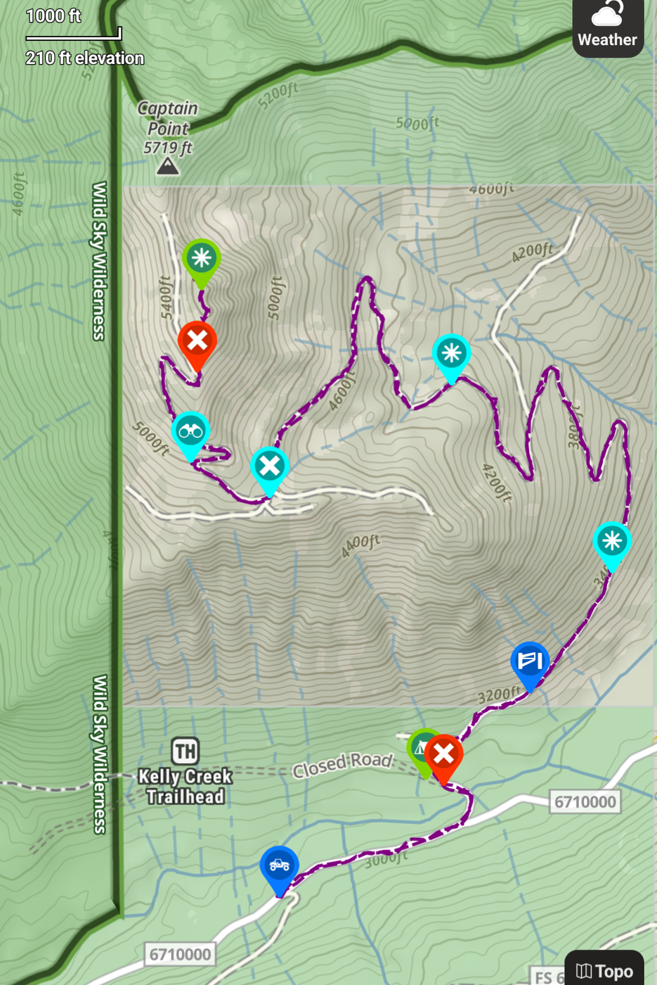 I broke trail up the road to 5400ft, then went off trail heading north to the summit of the peak right before Captain Point, which has an elevation of 5650, which I'll call First Mate Peak. I found a not too steep path to the summit with partial views on the way up. On the summit there's some trees but good views too. Glacier Peak and neighbor Captain Point are visible from the summit.
