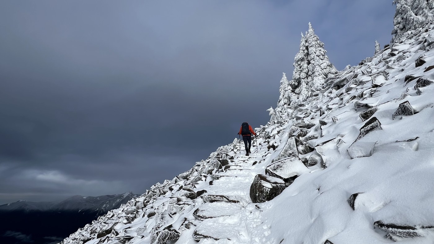 Awesome trip up to the summit with Aferrenberg, as we had some great weather and got some nice views. Snow started around 3200ft or so. Once we got out into the open the trail conditions were great as there was a nice boot path in the snow all the way up to the summit. The snow was very grippy with microspkes which made the ascent and especially the descent quite pleasant. Fantastic day, and it was fun to see some friendly faces on the trail!!