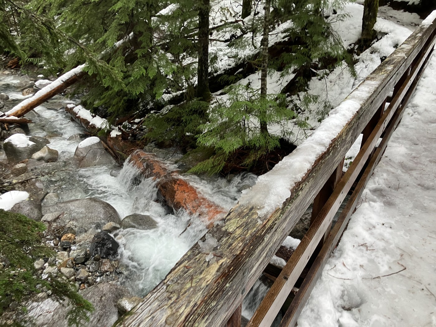 After playing in the parking lot, we hiked the Asahel Curtis Nature Loop. We hiked without spikes, and it was mostly fine, but a little slippery at a few points. There were 3-4 trees downed on the trail which we needed to go over or under. Hiked with 3 kids who enjoyed playing in the snow along the trail. The kids rated the trail 3/10, 7/10, and 4/10.