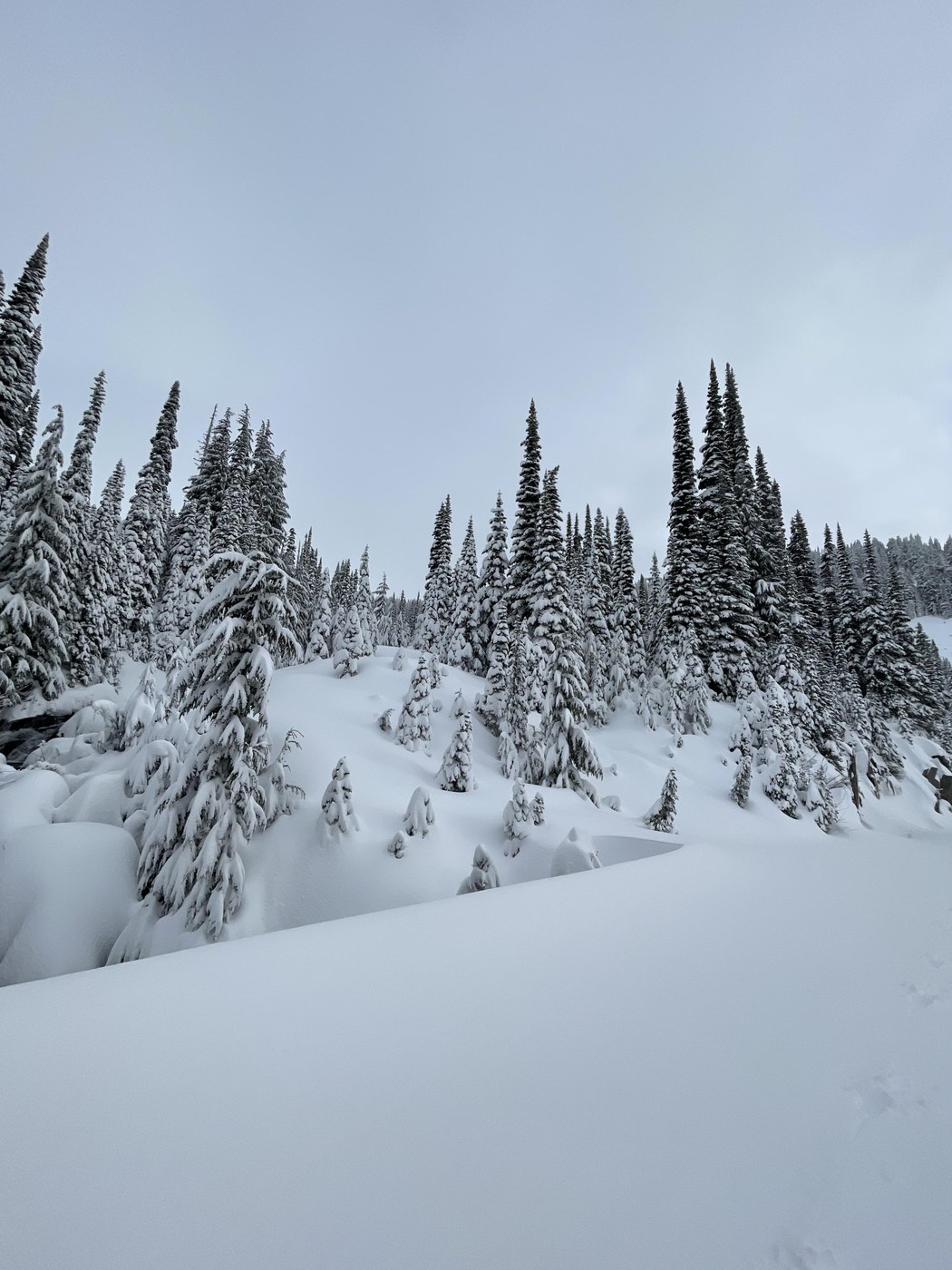 Since Nisqually Vista was a no-go and I wasn't interested in Skyline just yet, I hit Valley Rd, which is closed to vehicles, but open to ski and snowshoe travel. Super soft snow. At times, I sank a foot at least with my snowshoes. The trees are heavily loaded with snow. Winter wonderland all the way down to a nearly monochormatic colorscape. The poles are up on the road at 4th crossing where the rangers would like people to turn around due to avalanche chutes beyond that point. It looked like no one had been up Mazama Ridge yet.