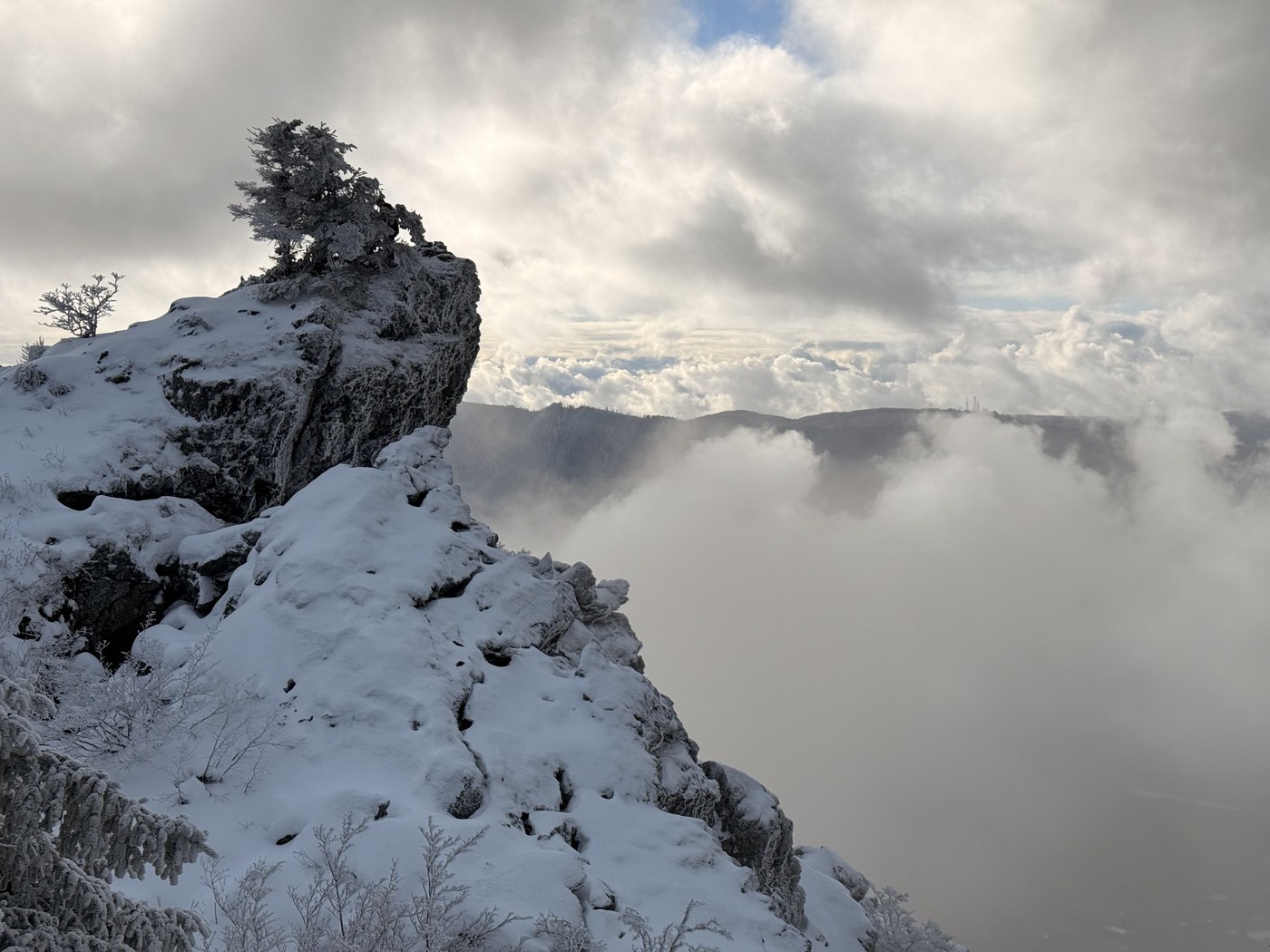 Started out with some fog, but it cleared up pretty quickly. Really nice day for a hike overall. Around 1.7 miles in, I started seeing a bit of snow on the trail. It gradually increased as I went up, but it was packed down and easy to walk on. I threw on my microspikes for part of the way down, though plenty of people were doing fine without them. Still, it doesn’t hurt to have them, especially for the descent.