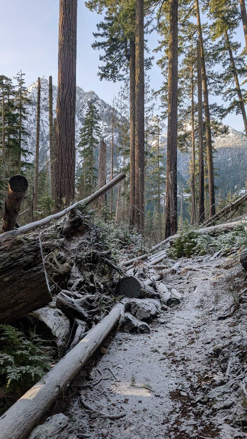 I've hiked Duckabush in every season and all kinds of weather and I don't think I've ever had the pleasure of having it all to myself before today, but I'll take it. Gorgeous, sunny morning giving way to gray skies in the afternoon; cold, but not windy. There's a dusting of snow starting around Snack Rock and it gets slightly more consistent as you ascend The Hump, but the trail is mostly clear on the other side and it never gets deeper than crust. Spikes are completely unnecessary, but poles were very helpful.