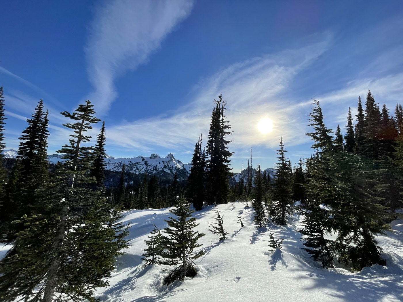 Note on the road and lots: Today there was compact snow and ice from just before Longmire all the way to Paradise. 2-wheel drive had to chain up (I think at Longmire). Taking it slow, my Subaru Crosstrek did fine. One slip-n-slide moment near Longmire. The lower elevations seemed icier. With all the melting today from the warm temps, I imagine it will be an icy drive in the morning. The lots were icy in the morning and slushy in the afternoon. It gets dark in the forest on the lower half of the drive by 3pm.