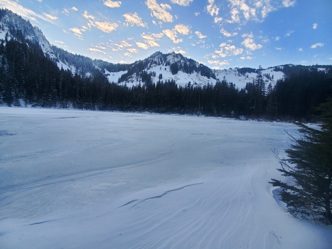 I went left of the lake when I arrived. I was surprised I had to break trail. I didn't have the lake to myself. A few people slept on the other side of the lake. They were very respectful and quite. The lake is frozen over. Please stay off the lake. SAR's would appreciate that advice.