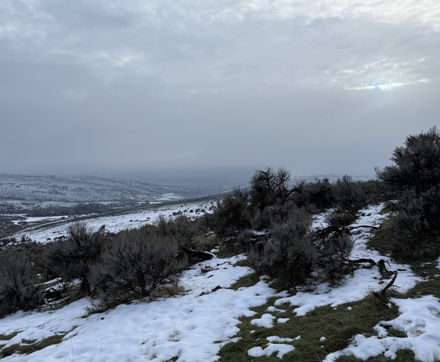 Well, there is no real trail and we just hiked cross country. Some ATV trailers in the slushy parking lot but saw no one. Found deer bones and a strange creek. Mostly, but not completely, under a thin layer of snow…