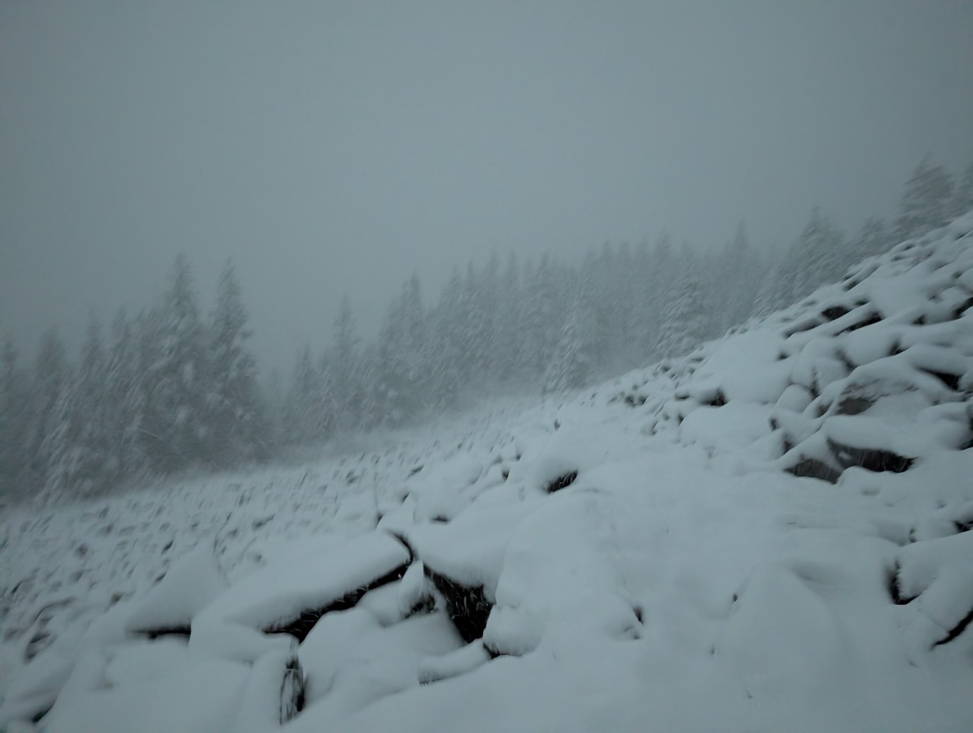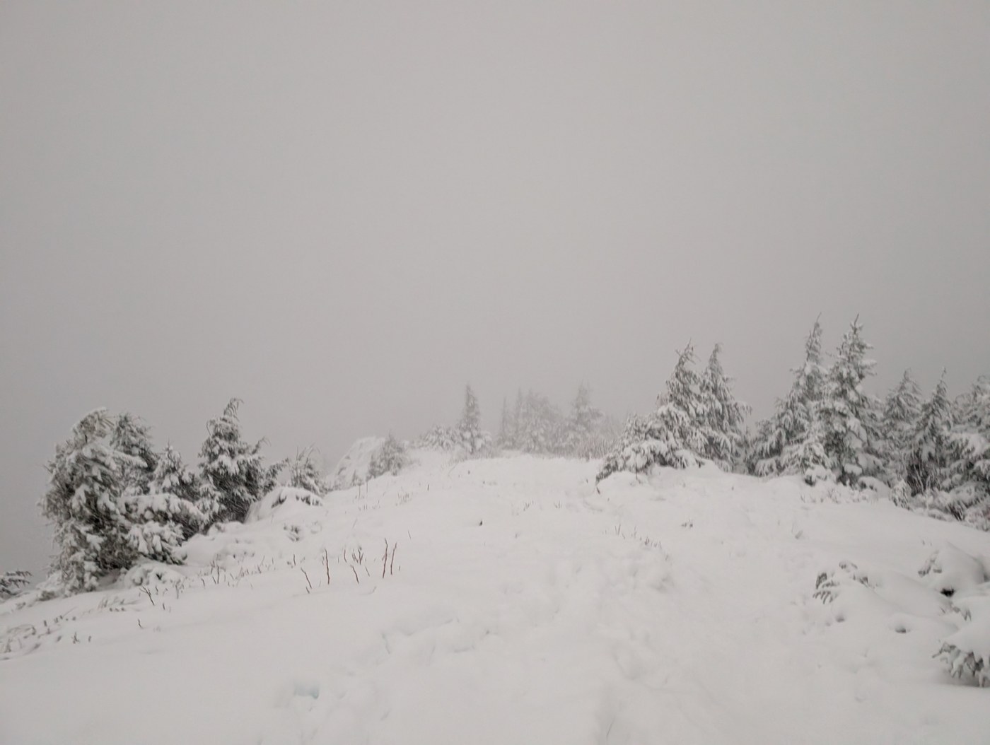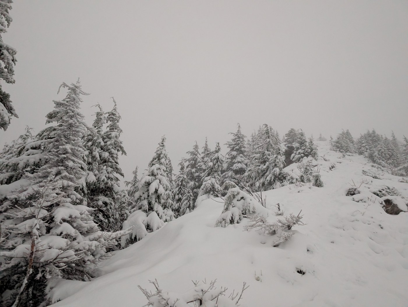 Started late at 3pm. Trail is muddy almost all the time. I did hit first snow couple hundred feet below intersection with the new trail. Trail is snow covered all the way from boulder field to the summit. I didn't use any traction on my way up but spikes can be helpful. Snow wasn't too deep, hiking shoes worked fine for me. I met last hikers for the day at boulder field and had summit for myself. Spent maybe 5 min on the summit taking photos, putting layers/gloves and spikes on. It started to snow heavily, I couldn't see my boot track on the way down, most likely it will be much more snow tomorrow. Descended old trail with headlamp.
