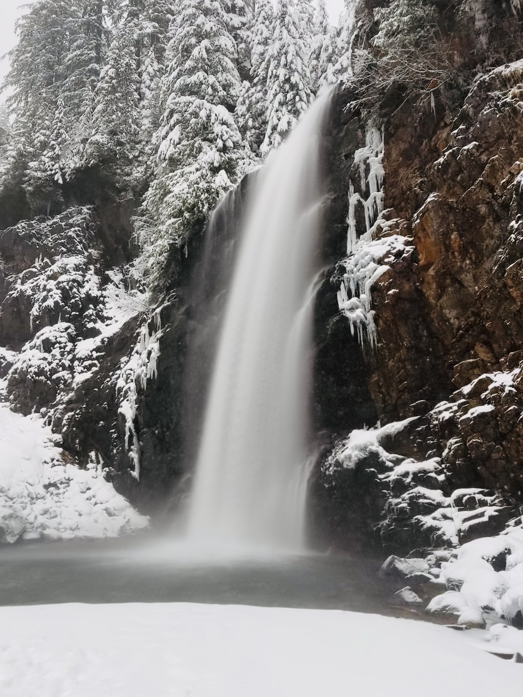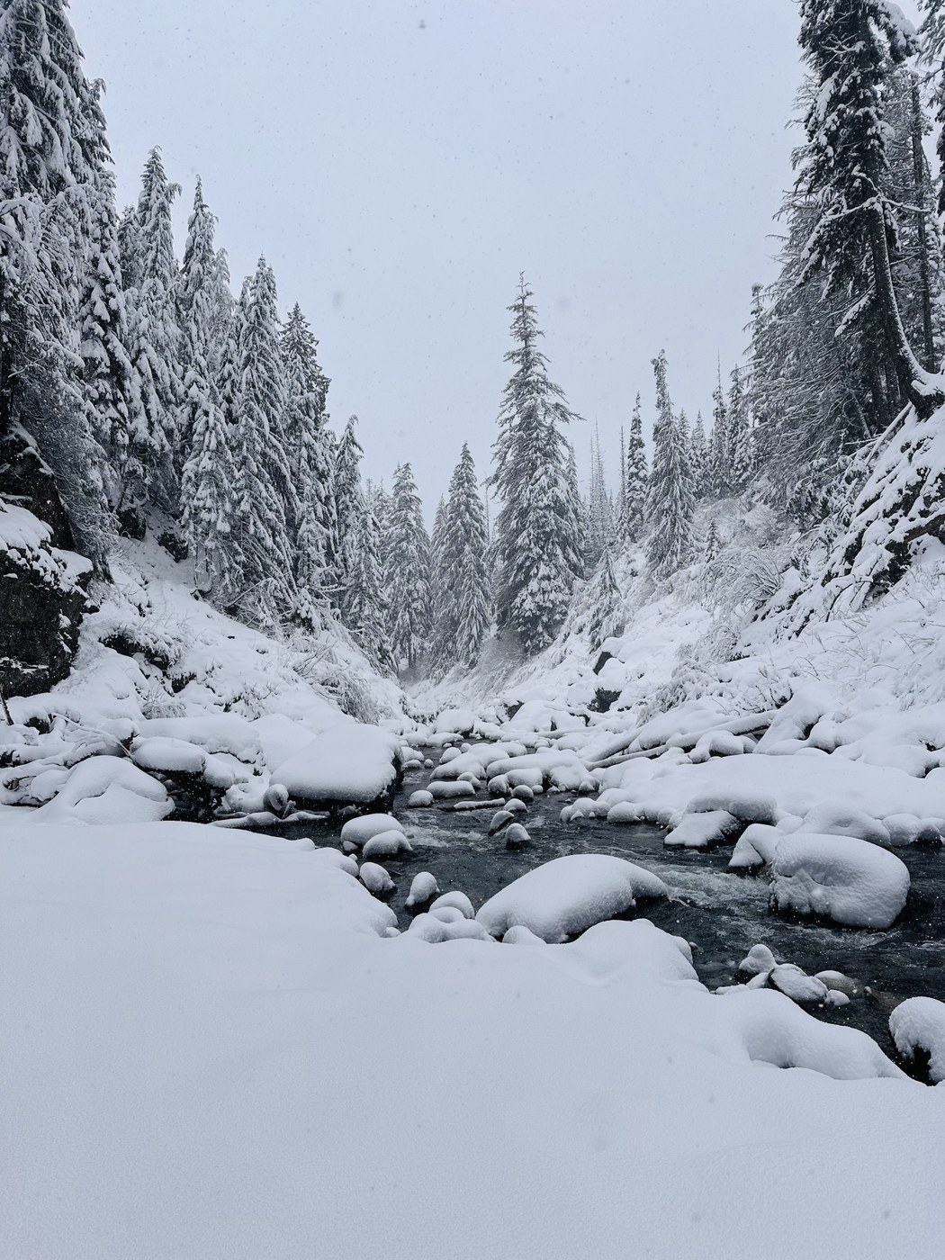 Beautiful day with fresh snow and light snow falling. Went from snow park at exit 47. 7 miles round trip since have to walk road. Road snowy entire way but a local drove down on way back so tire path to pavement. Did not need spikes or snowshoes as traction good and snow packed down.