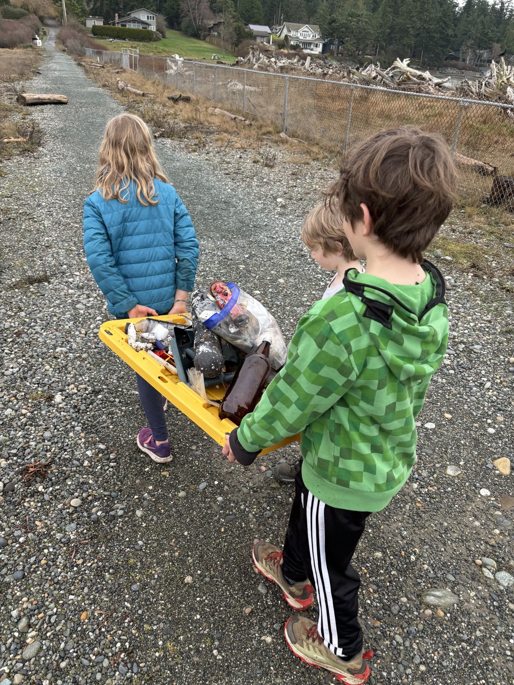 A really nice morning at Kukutali Preserve. We arrived just after 10 am. No other cars in the parking lot. Toilet was open and weather was cloudy and 57. A lot of driftwood has washed up on the shore and with that, litter. We started with the South trail which is muddy in a few places. Hiked out towards Flagstaff island and then back. We went down to the beach at the picnic area and explored around a little before heading back along the north trail. Daisies in bloom in the field at the picnic area. We collected all types of trash from in the the driftwood like bottles, candy wrappers, fishing line and even a yellow storage bin lid. Originally, I was only going to grab the fishing line and throw it away but my kids had fun searching through everything to see what they could find to help clean up this beautiful place. We always try to leave our favorite places a little better.