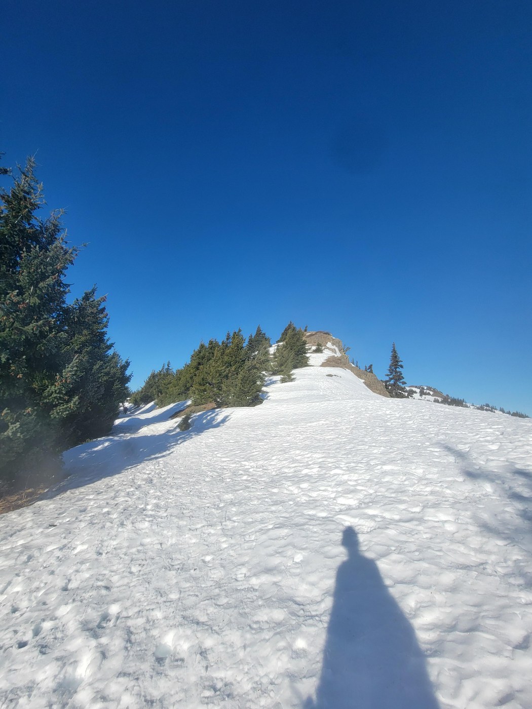 Snow the whole way. Not enough snow for the winter route. Had to use the summer route. One tree over the path before the last hill, currently snow up to the bottom of it. Easy to cross today. Most people had snowshoes or spikes.