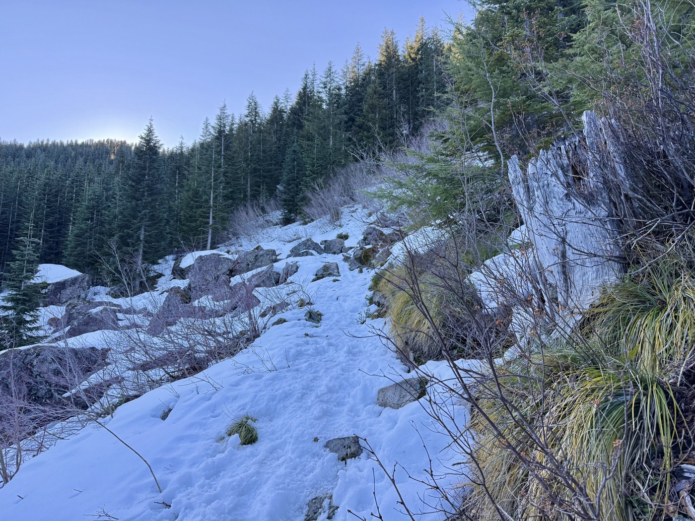 Good hike to do this three day weekend of clear sunny weather. Could make out parts of Puget Sound and the Olympics from up there! Also nice to see Masonry Pool and Rattlesnake Lake back to decent water levels. Took snowshoes (just in case), crampons, and yaktrax. Only used the yaks. Loads and loads of fallen trees to go over, under, or around. I haven’t been here since 2024, so I don’t know if all of this is brand new or it’s just been building up over the past year or two. Water flowing over or through the trail was not an issue with waterproof boots on. Parking was easy and the pit toilet was available with a trashcan inside.